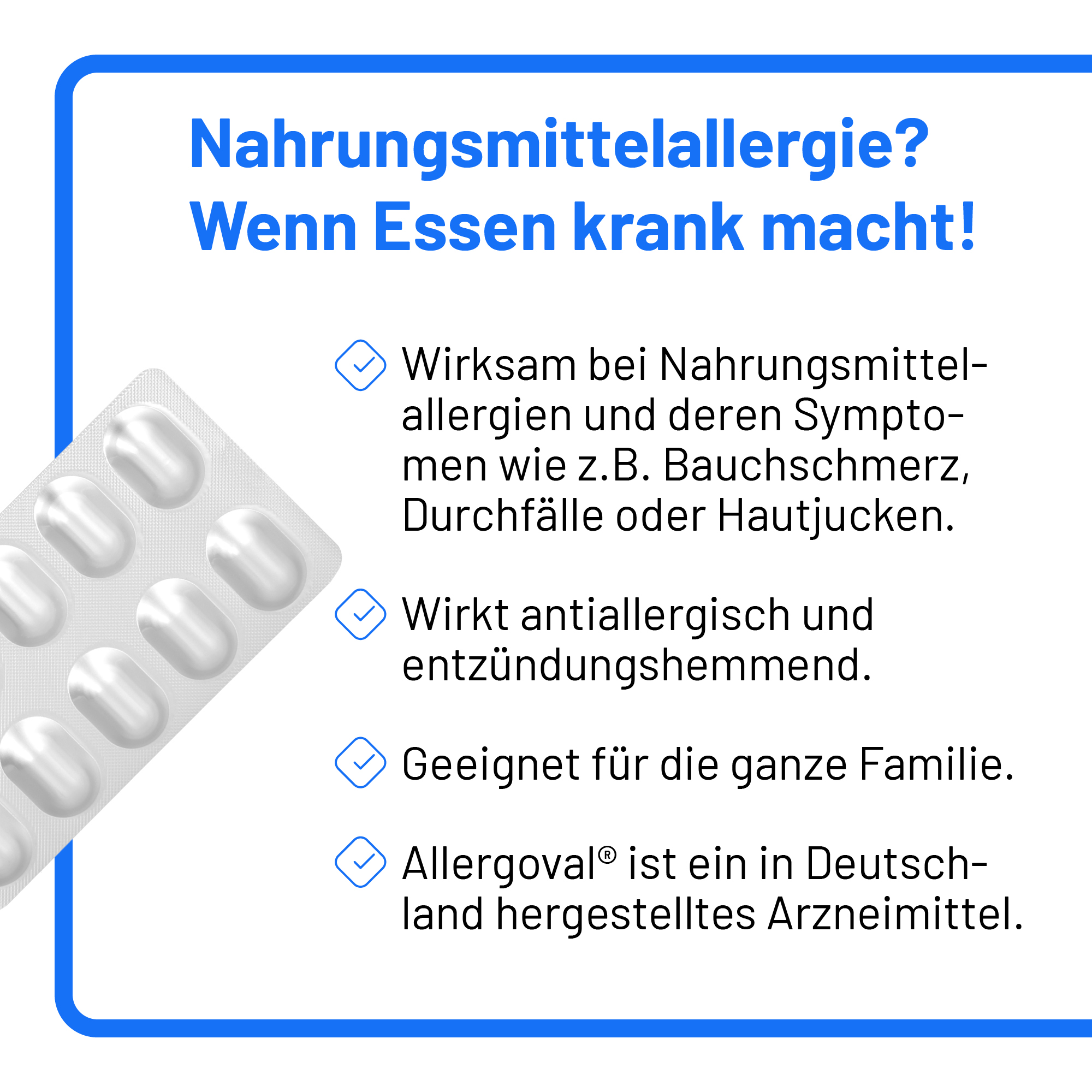 Nahrungsmittelallergie: Fälle von Ekzem, Nesselsucht (Urticaria), Quincke-Ödem, Hautjucken, gastrointestinalen Störungen (Erbrechen, Brechreiz, Durchfälle, Bauchschmerz). Asthma und Nasenkatarrh (Rhinitis), bei denen Nahrungsmittelallergene die hauptsächlichen auslösenden Faktoren darstellen. Hinweis: Für die Behandlung des akuten Asthmaanfalles sind Allergoval Kapseln nicht geeignet.