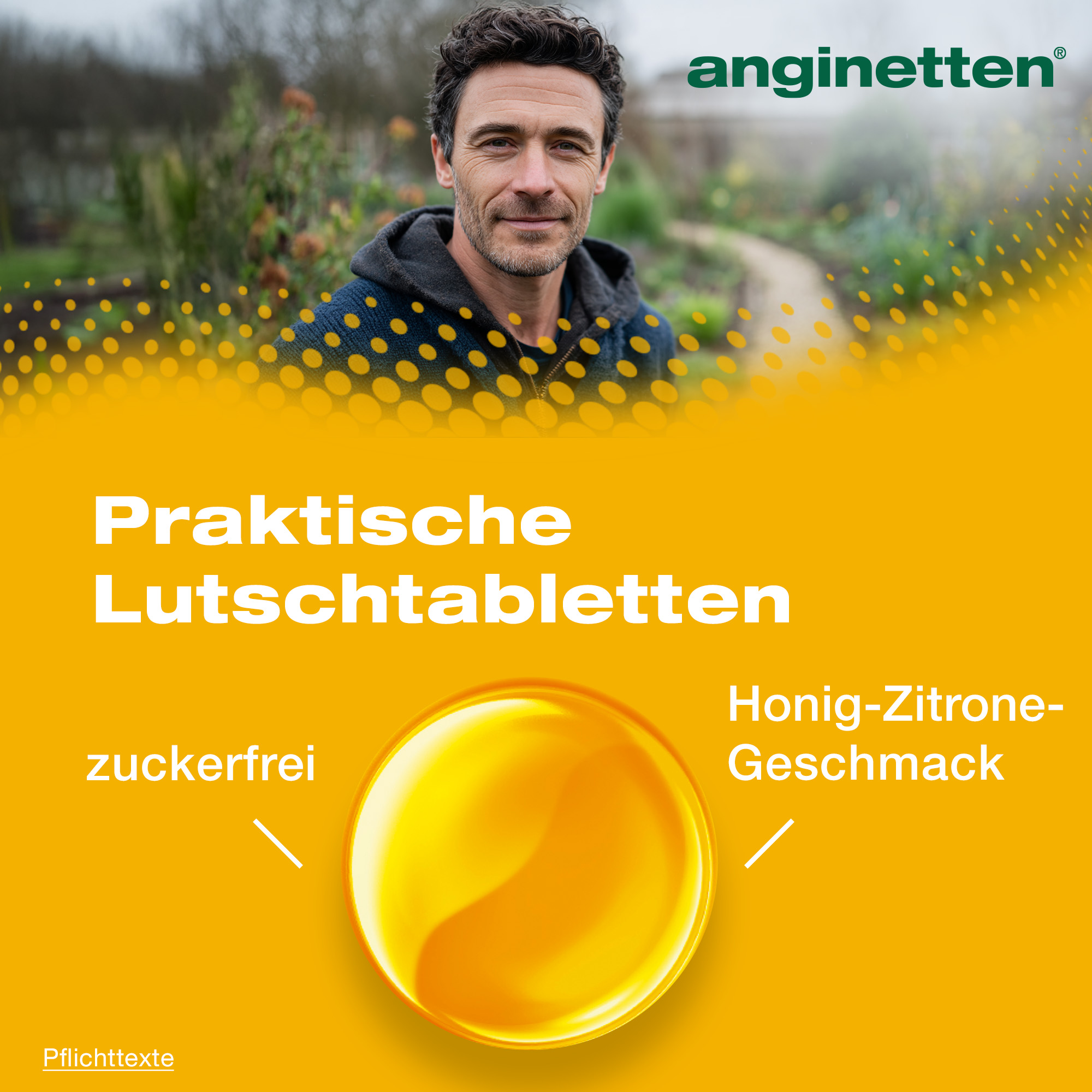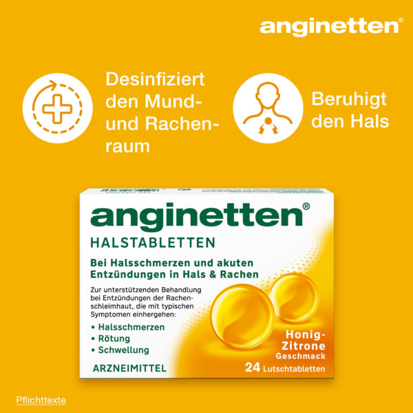 anginetten® Halstabletten zuckerfrei desinfizieren den Mund- und Rachenraum, beruhigen den Hals.