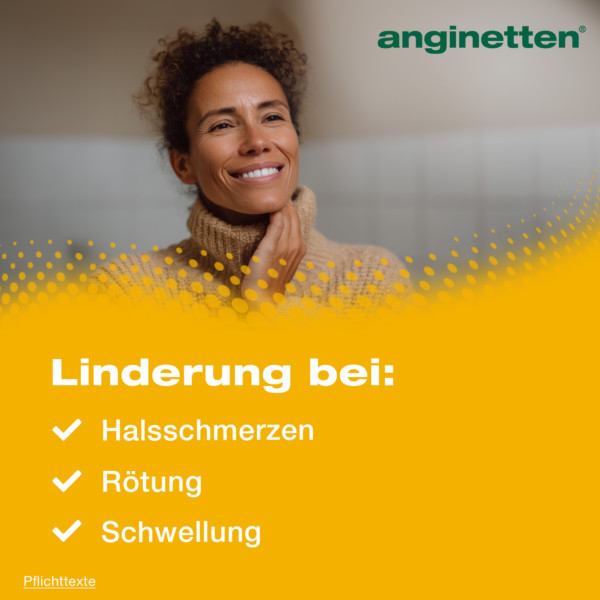 anginetten® Halstabletten zuckerfrei werden zur unterstützenden Behandlung bei Entzündungen der Rachenschleimhaut angewendet,