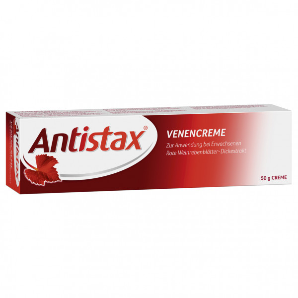 Antistax® Venencreme. Wirkstoff: Dickextrakt aus roten Weinrebenblättern. Anwendungsgebiet: Traditionell angewendet bei Erwachsenen zur Linderung von Beschwerden und Schweregefühl der Beine im Zusammenhang mit leichten venösen Durchblutungsstörungen. Hinweis: Enthält Cetylstearylalkohol und Propylenglycol. Packungsbeilage beachten.