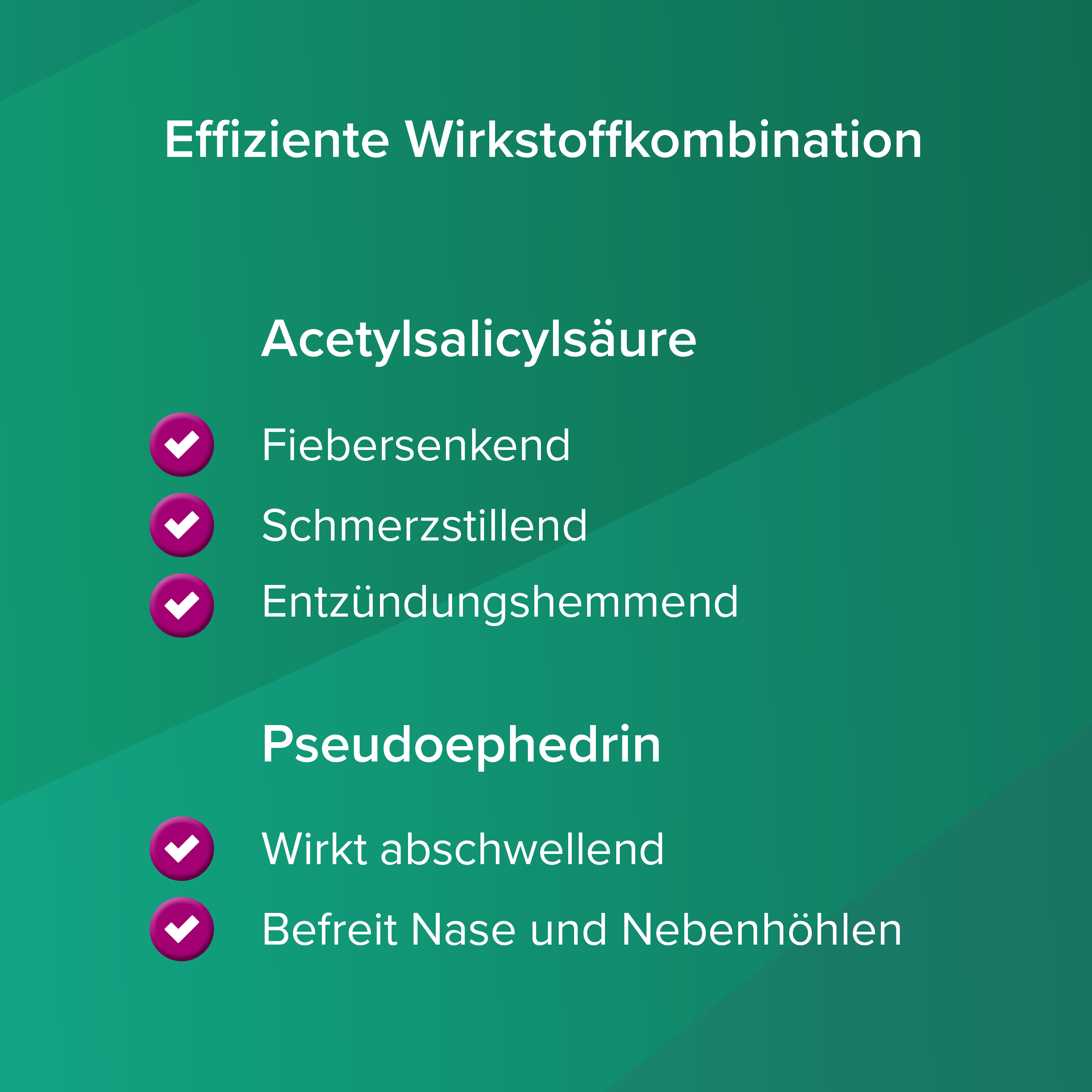 - Das weiße Granulat enthält zwei Wirkstoffe, Acetylsalicylsäure und Pseudoephedrinhydrochlorid.