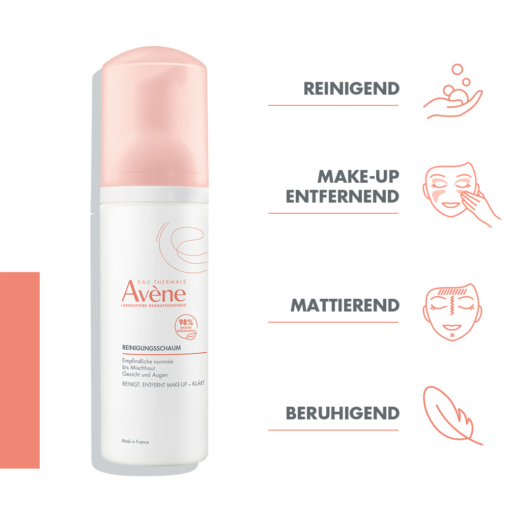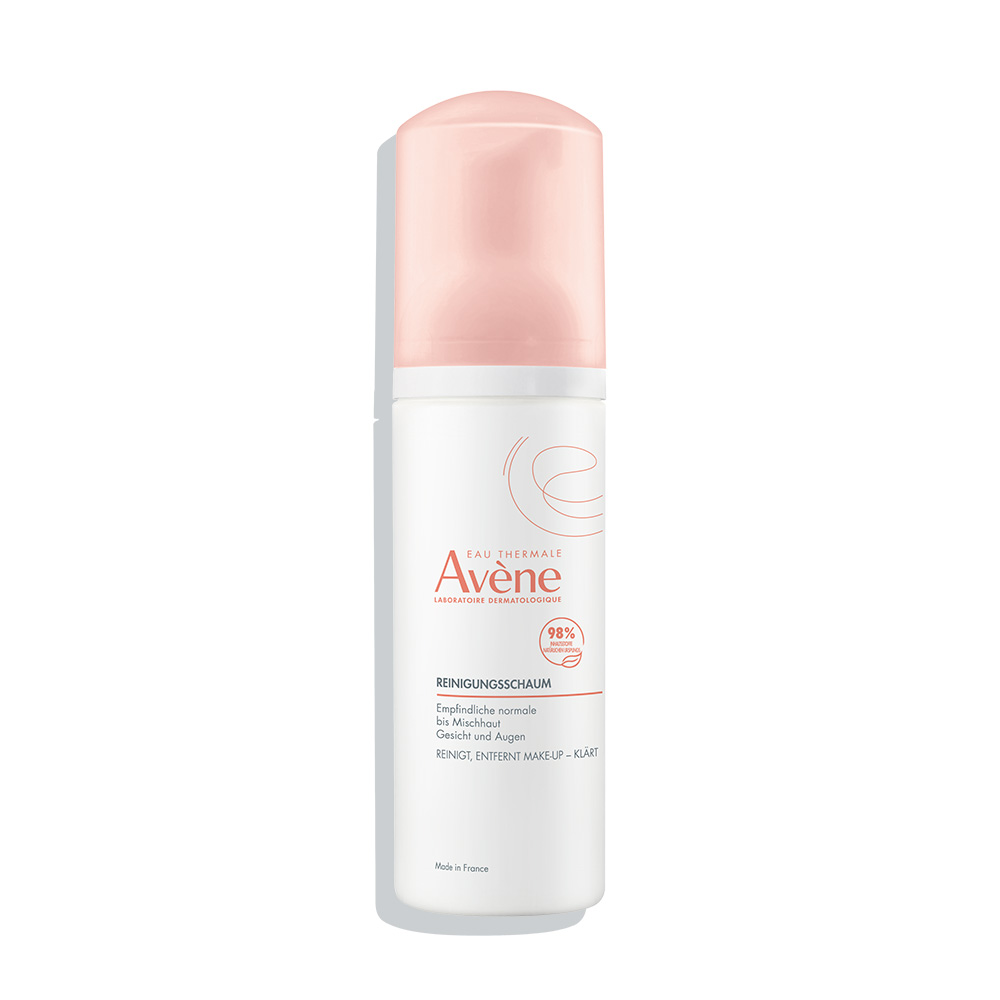Dieser reichhaltige, luftige Schaum mit zartem Duft entfernt Make-up, reinigt und beruhigt die Haut dank der Formulierung mit Avène Thermalwasser und Glycerin für mehr Komfort. Die seifenfreie Formulierung enthält ein Minimum an Aktivstoffen in der richtigen Dosierung, um Wirksamkeit und Verträglichkeit zu gewährleisten*. Reinigungs- und Make-up-Entfernungsschaum für die Augen und normale bis empfindliche Mischhaut, reinigt und entfernt Unreinheiten und überschüssigen Talg. Mit 98 % Inhaltsstoffen natürlichen Ursprungs und ohne Bestandteile tierischen Ursprungs bewahrt sie das natürliche Gleichgewicht der Haut. Die Haut wird klar, weich und angenehm. Die Verpackung des 150ml-Reinigungsschaums besteht zu 49 % aus recycelten Materialien. Die Flasche besteht aus 100 % recyceltem Kunststoff**. * Monozentrische Studie an 31 Probanden mit empfindlicher Haut und Augen, zweimal täglich auf Gesicht, Augen, Lippen und Dekolleté aufgetragen ** Ohne Pumpe und Kappe