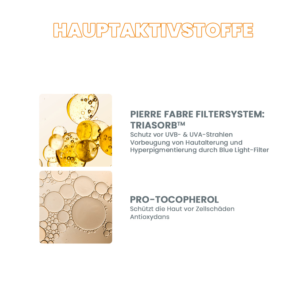 [TriAsorB™]: unser 1. organischer Sonnenfilter, bewahrt die Haut vor UVB- und UVA-Strahlen. Und er schützt auch vor dem kurzwelligen blauen Anteil des Tageslichts, dem sogenannten HEV-Blue-Light und bietet somit einen zusätzlichen Schutz vor Hautalterung und Hyperpigmentierung infolge kurzwelligem Blue Light.