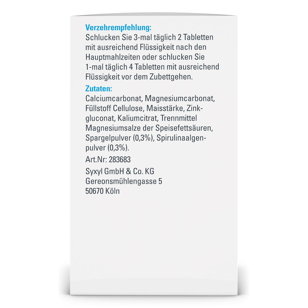 Calciumcarbonat, Cellulose, Maisstärke, Calcium-Ion, Magnesiumcarbonat, Magnesium-Ion, D-Gluconsäure. Zinksalz (2:1), Zink-Ion