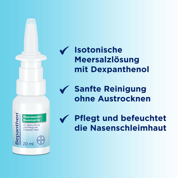 Bepanthen Meerwasser-Nasenspray hilft schnell und wirksam bei trockener Nase und als begleitende Maßnahme bei Erkältung oder Heuschnupfen. Bepanthen Meerwasser-Nasenspray befeuchtet, reinigt und pflegt die Nase und sorgt mit Meerwasser natürlichen Ursprungs und Dexpanthenol für eine gesunde Nasenschleimhaut.