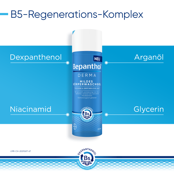 Der B5-Regenerations-Komplex unterstützt die Regeneration der Haut – von innen nach außen. Dabei fördert Dexpanthenol in tieferen Hautschichten der Epidermis die natürliche Zellregeneration. Das enthaltene Glycerin spendet sofortige und lang anhaltende Feuchtigkeit. Niacinamid (Vitamin B3) beruhigt juckende, trockene Haut und Arganöl ergänzt fehlende Hautlipide. Das physiologische Lipid unterstützt zusätzlich die Anordnung der Doppellipidschicht.