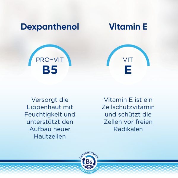 Dexpanthenol stellt den Lippen Feuchtigkeit zur Verfügung und unterstützt die Haut gleichzeitig bei der Produktion neuer Zellen.