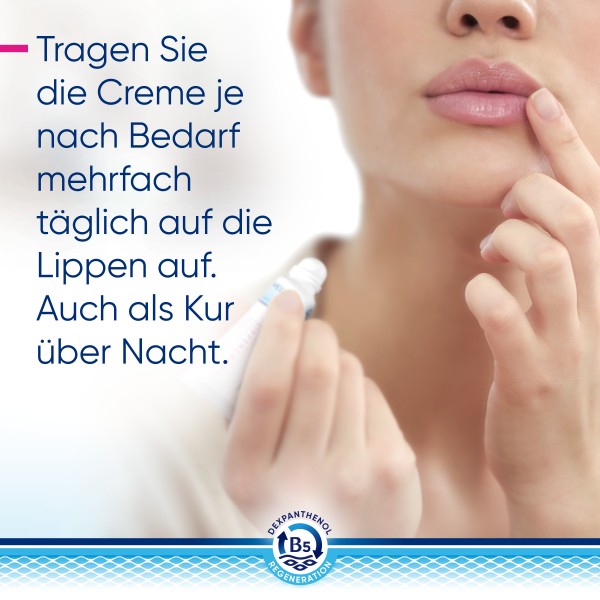 Die Anwendung der Bepanthol® Reichhaltigen Lippencreme: Bei Bedarf – also, wenn sich die Lippen trocken und/oder rissig anfühlen – tragen Sie die Creme auf die strapazierten Lippen auf. Für besonders reichhaltige Pflege können Sie die Bepanthol® Reichhaltige Lippencreme auch als Kur über Nacht einsetzen. Dazu cremen Sie sie vor dem Schlafengehen besonders sorgfältig ein.