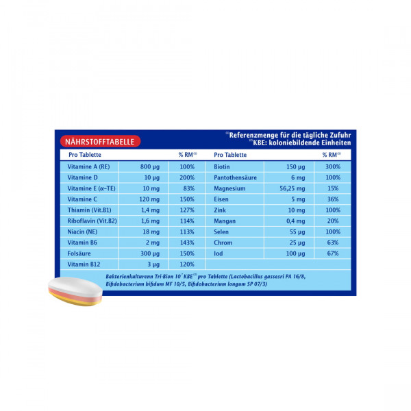 Calciumphosphate; Füllstoff: Cellulose; Ascorbinsäure; Magnesiumoxid; Inulin; DL-alpha-Tocopherylacetat; Überzugsmittel: Hydroxypropyl- methylcellulose; Maltodextrin; Dextrose; Trennmittel: Mono- und Diglyceride von Speisefettsäuren; Nicotinamid; Füllstoff: Polyvinylpyrrolidon; Überzugsmittel: Hydroxypropylcellulose; Stärke; Eisensulfat; modifizierte Stärke; Zinkoxid; Füllstoff: Polyvinylpolypyrrolidon; Trennmittel: Magnesiumsalze der Speisefettsäuren; Calcium-D-pantothenat; Füllstoff: vernetzte Natriumcarboxymethylcellulose; Pyridoxinhydrochlorid; Thiaminmononitrat; Riboflavin; Farbstoff: Eisenoxide und Eisenhydroxide; Trennmittel: Siliciumdioxid; Bakterienkulturen (Lactobacillus gasseri PA 16/8, Bifidobacterium bifidum MF 20/5, Bifidobacterium longum SP 07/3)*; Mangansulfat; Retinylacetat; Zucker; Folsäure; D-Biotin; Kaliumiodid; mittelkettige Triglyceride (aus Palmöl); Chrom-(III)-chlorid; Natriumselenat; Cholecalciferol; Cyanocobalamin.* Kann Spuren von Milchprotein, Fisch und Soja enthalte