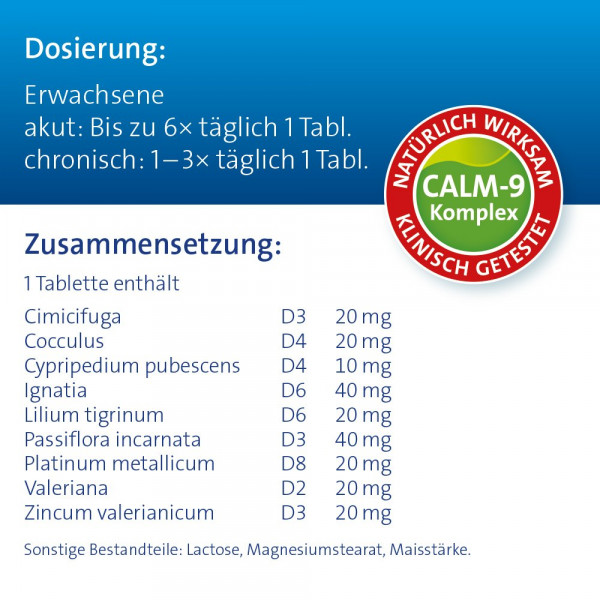 Calmvalera Tropfen enthalten mit dem „Calm-9-Komplex“ eine bewährte Kombination aus neun sorgfältig ausgesuchten naturheilkundlichen Wirkstoffen (Tigerlilie, Frauenschuh, Traubensilberkerze u.a.), die auf natürliche Weise wirken. Das rezeptfreie Arzneimittel ist gut verträglich und kann auch über längere Zeit eingenommen werden. Es treten keine Gewöhnungseffekte auf – auch nicht bei Anwendung über einen längeren Zeitraum. Calmvalera Tropfen machen nicht müde oder schläfrig und sind daher geeignet für Autofahrer und Menschen, die sich im Beruf stets konzentrieren müssen.