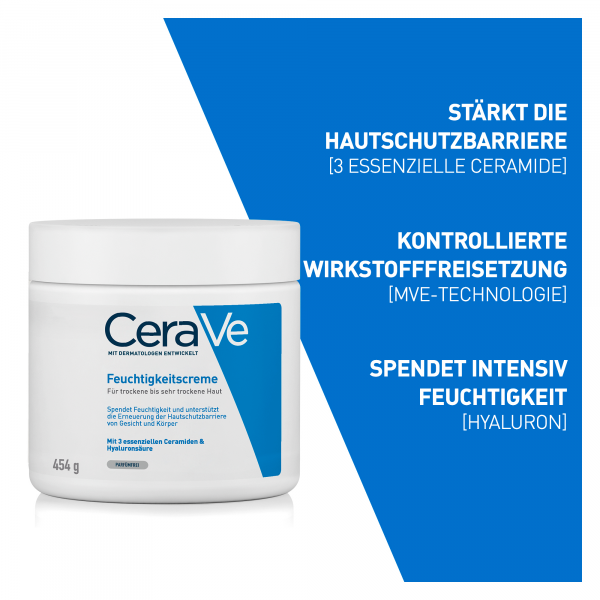Reichhaltige Feuchtigkeitspflege für die ganze Familie Die CeraVe Feuchtigkeitscreme für Gesicht und Körper hydratisiert die Haut, beugt Austrocknung vor und stärkt die Hautschutzbarriere. CeraVe Feuchtigkeitscreme für trockene bis sehr trockene Haut Die Hautpflege zeichnet sich durch ihre patentierte MVE-Wirkstoff-Freisetzung aus, die die aktiven Wirkstoffe über den Tag verteilt freisetzt. Dank Hyaluron und drei essenziellen Ceramiden wird die Haut kontinuierlich mit Feuchtigkeit versorgt und die natürliche Hautschutzbarriere gestärkt – für ein angenehm weiches Hautgefühl. Die CeraVe Feuchtigkeitscreme enthält keine Dufstoffe und eignet sich auch bei Neurodermitis und für Allergiker.