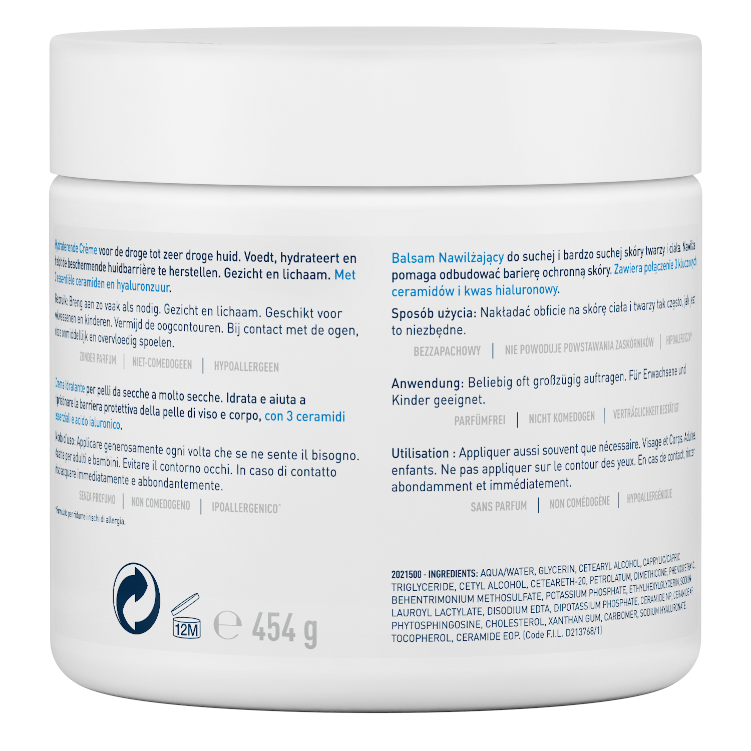 AQUA / WATER • GLYCERIN • CETEARYL ALCOHOL • CAPRYLIC/CAPRIC TRIGLYCERIDE • CETYL ALCOHOL • CETEARETH-20 • PETROLATUM • DIMETHICONE • PHENOXYETHANOL • BEHENTRIMONIUM METHOSULFATE • POTASSIUM PHOSPHATE • ETHYLHEXYLGLYCERIN • SODIUM LAUROYL LACTYLATE • DISODIUM EDTA • DIPOTASSIUM PHOSPHATE • CERAMIDE NP • CERAMIDE AP • PHYTOSPHINGOSINE • CHOLESTEROL • XANTHAN GUM • CARBOMER • SODIUM HYALURONATE • TOCOPHEROL • CERAMIDE EOP (F.I.L. D213770/1).