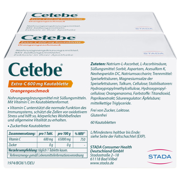 Vitamin C ist für eine Vielzahl von physiologischen Funktionen wichtig. Unser Körper benötigt eine ständige Versorgung mit Vitamin C, da er es nicht selbst herstellen kann. Neben der normalen Funktion des Immunsystems unterstützt Vitamin C die Erhaltung der normalen Funktion von Knochen, Zähnen, Knorpeln, Zahnfleisch und Haut, da es zur Bildung von Kollagen beiträgt. Darüber hinaus ist Vitamin C ein Antioxidans, das die Zellen vor oxidativem Stress schützt und zur Verringerung von Müdigkeit und Ermüdung beiträgt. Cetebe® Extra-C 600 mg Kautabletten mit Orangengeschmack enthalten 600 mg Vitamin C und können ganz einfach ohne Flüssigkeit eingenommen werden.