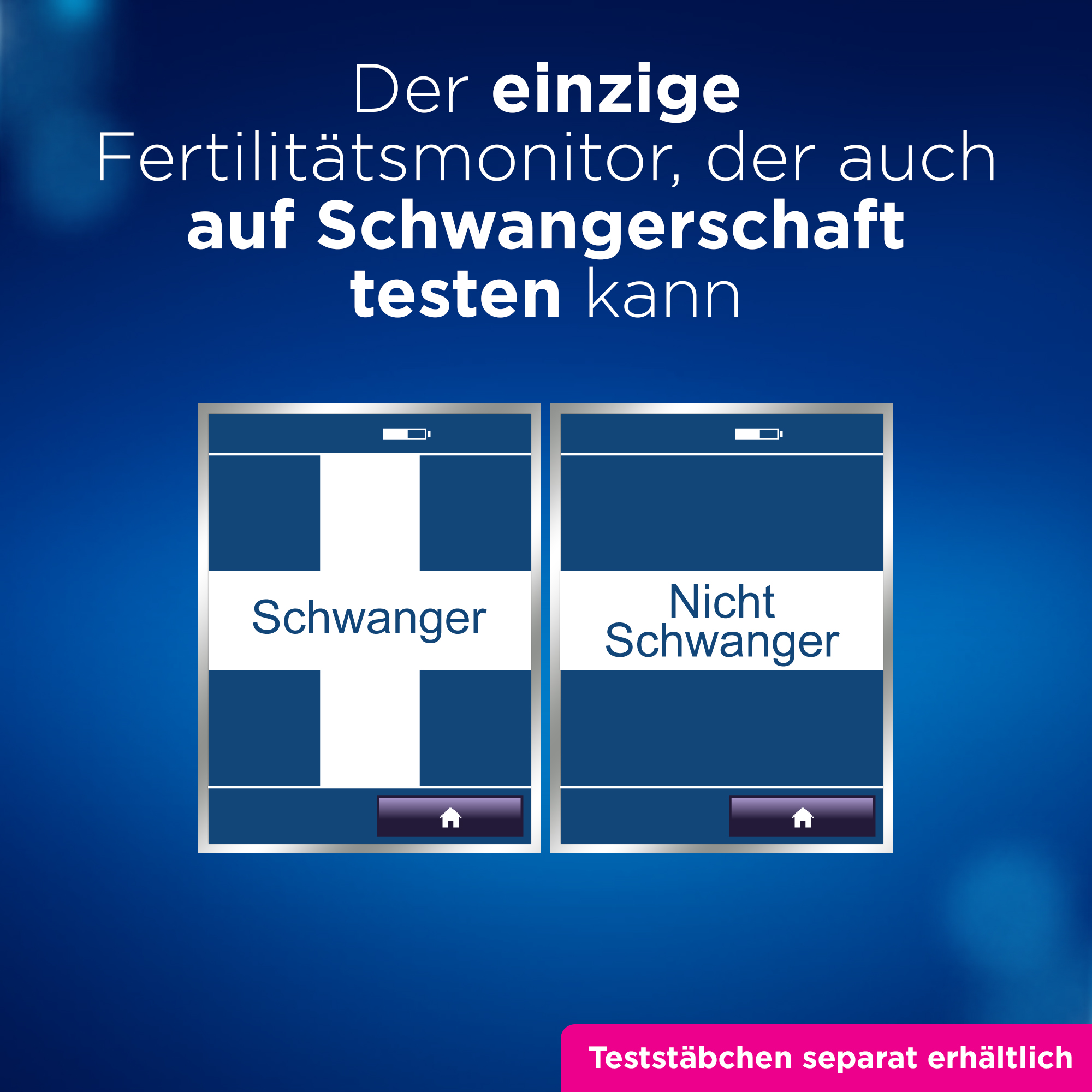 Teststäbchen sind in dieser Packung NICHT enthalten. Diese Packung enthält 1 Clearblue Fertilitätsmonitor Advanced, der nur mit Clearblue Fertilitätsmonitor Advanced Fruchtbarkeitsteststäbchen und Clearblue Fertilitätsmonitor Advanced Schwangerschaftsteststäbchen verwendet werden kann – alle separat in der Clearblue Fertilitätsmonitor Advanced Teststäbchen-Nachfüllpackung erhältlich: 30 Fruchtbarkeitstests für den Eisprung & 3 Schwangerschaftstests.