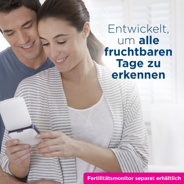 Der Clearblue Fertilitätsmonitor Advanced (nicht enthalten, separat erhältlich) erhöht nachweislich die Chancen, auf natürliche Weise schwanger zu werden, um 89 %.1  Er zeichnet sich dadurch aus, alle Ihre fruchtbaren Tage zu erkennen. Dies sind in der Regel bis zu 6 Tage und daher mehr als bei allen anderen Eisprung-Vorhersage-Kits, die nur das LH messen. Er ist tragbar, verfügt über ein dezentes und feminines Design und misst die zwei wesentlichen Fruchtbarkeitshormone: Östrogen und das luteinisierende Hormon. Ihre Fruchtbarkeitsinformationen werden auf dem benutzerfreundlichen Touchscreen angezeigt und die Daten von bis zu 6 Zyklen werden in der Zyklusübersicht zusammengefasst, um diese mühelos vergleichen zu können.