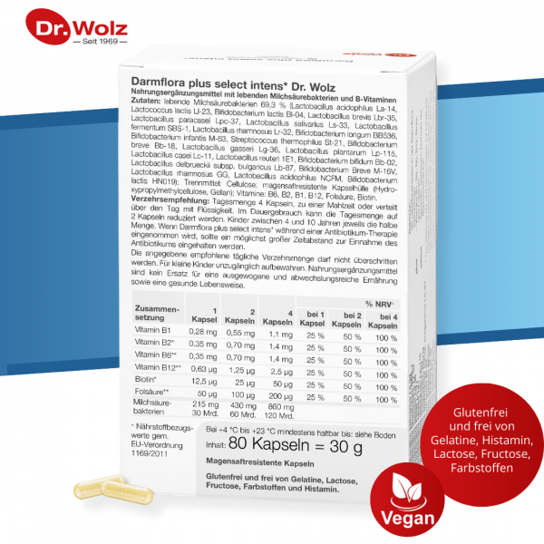 Darmflora plus select Dr.Wolz enthält 8 selektierte probiotische Kulturen in einer Konzentration von 48 Milliarden Milchsäurebakterien pro Tagesportion. Die Milchsäurebakterien sind doppelt geschützt gegen Magen- und Gallensäure. Darmflora plus select Dr.Wolz ist ein speziell für die Wiederherstellung einer gesunden Darmflora entwickeltes Präparat. Die selektierten Kulturen sind auf die unterschiedlichen Darmabschnitte des menschlichen Körpers abgestimmt.