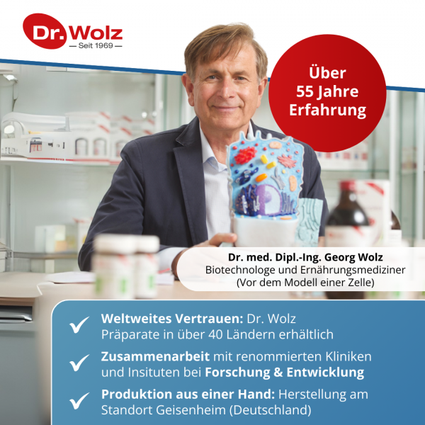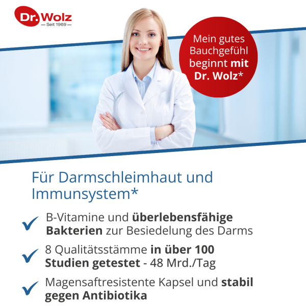 • Darmflora plus select Dr. Wolz ist ein speziell für die Förderung einer gesunden Darmschleimhaut entwickeltes Präparat. Die selektierten Kulturen kommen natürlicherweise in den unterschiedlichen Darmabschnitte des menschlichen Körpers vor und unterstützen hier die physiologische Darmflora in ihren Aufgaben sinnvoll. Die enthaltenen B-Vitamine fördern die Darmschleimhaut und das Immunystem(2,3).