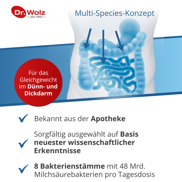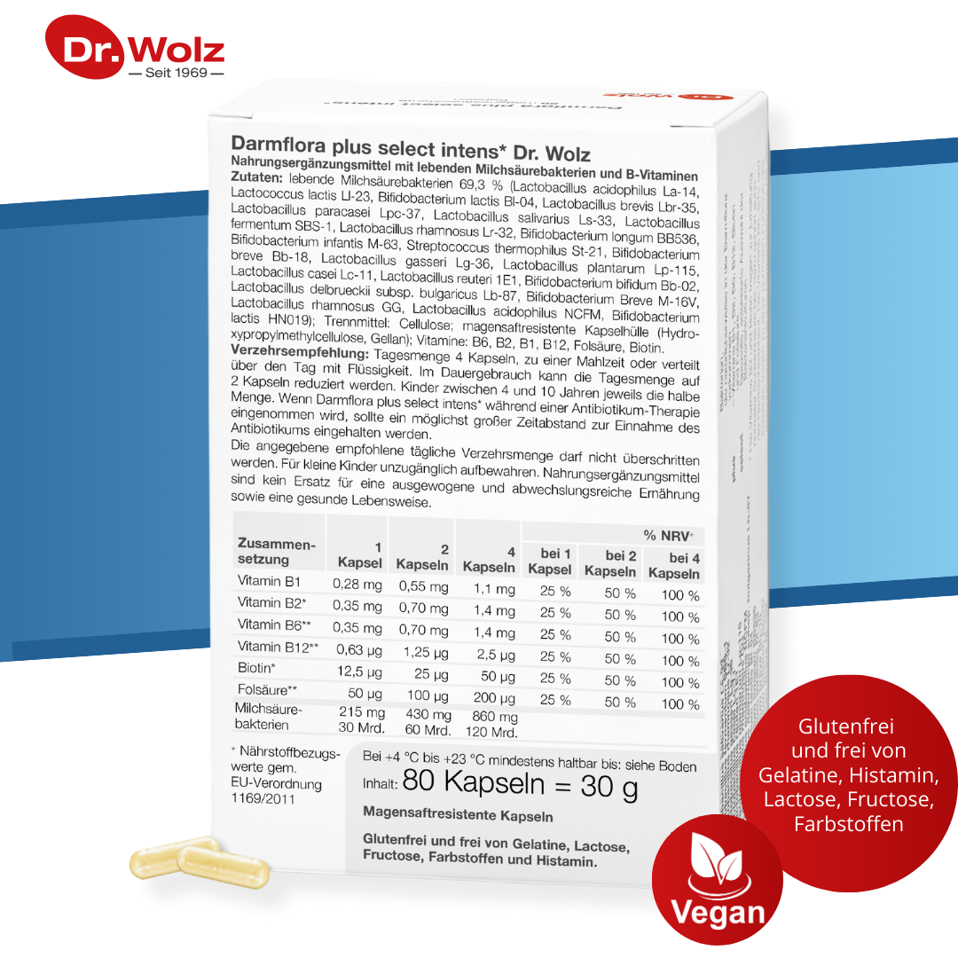 • Darmflora plus® select Dr.Wolz enthält 8 selektierte probiotische Kulturen in einer Konzentration von 48 Milliarden Milchsäurebakterien pro Tagesportion. Die Milchsäurebakterien sind besonders geschützt gegen Magen- und Gallensäure.