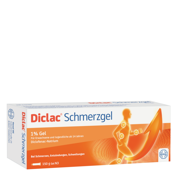 Diclac Schmerzgel 1% Gel. Wirkstoff: Diclofenac-Natrium. Anwendungsgebiete: bei Erwachsenen zur äußerlichen Behandlung von Schmerzen, Entzündungen und Schwellungen bei Sport- und Unfallverletzungen (Verstauchungen, Prellungen, Zerrungen), rheumatischen Erkrankungen der Weichteile (Sehnen- und Sehnenscheidenentzündungen, Schleimbeutelentzündungen, Entzündungen im Muskel- und Kapselbereich) und bei degenerativen Erkrankungen der peripheren Extremitätengelenke. Bei Jugendlichen ab 14 Jahren zur Kurzzeitbehandlung zur lokalen, symptomatischen Behandlung von Schmerzen bei akuten Prellungen, Zerrungen oder Verstauchungen infolge eines stumpfen Traumas.