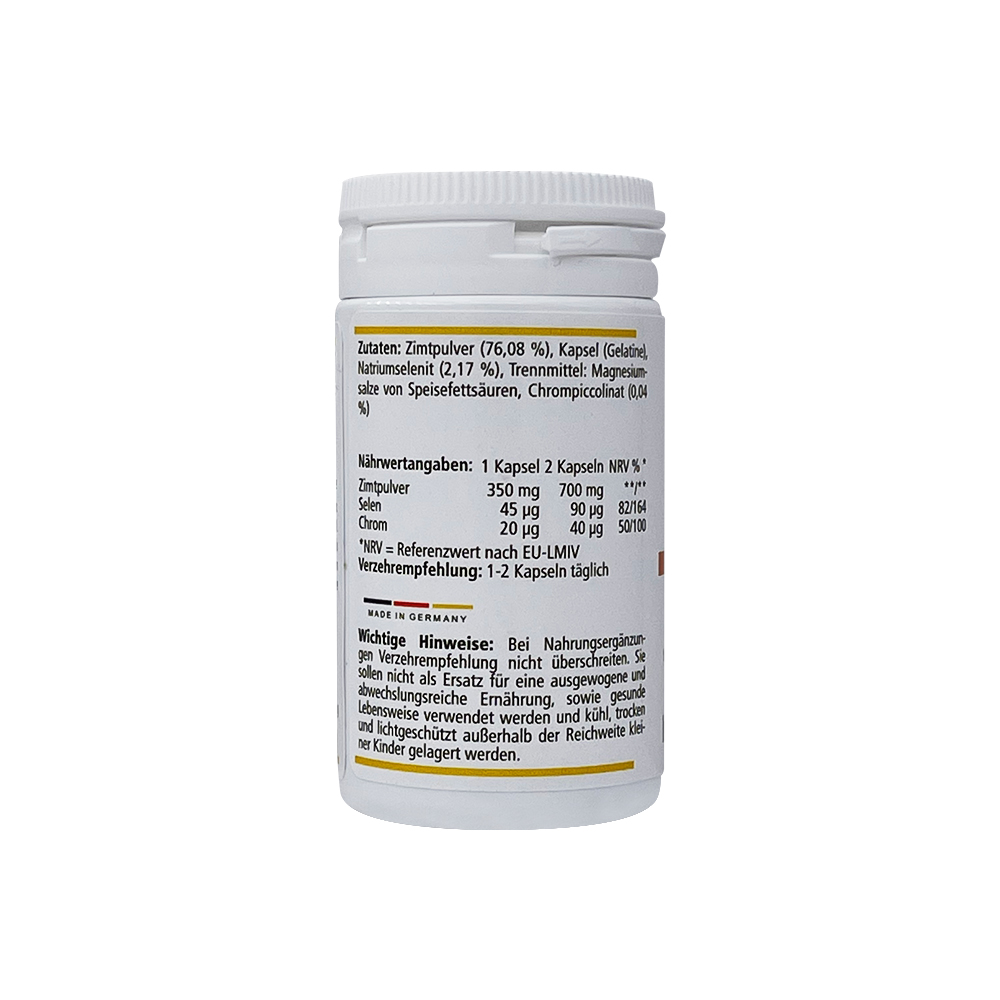 Zusammensetzung/Kapsel: Zimtpulver (76,08 %), Kapsel (Gelatine), Natriumselenit (2,17 %), Trennmittel: Magnesiumsalze von Speisefettsäuren, Chrompiccolinat (0,04 %)