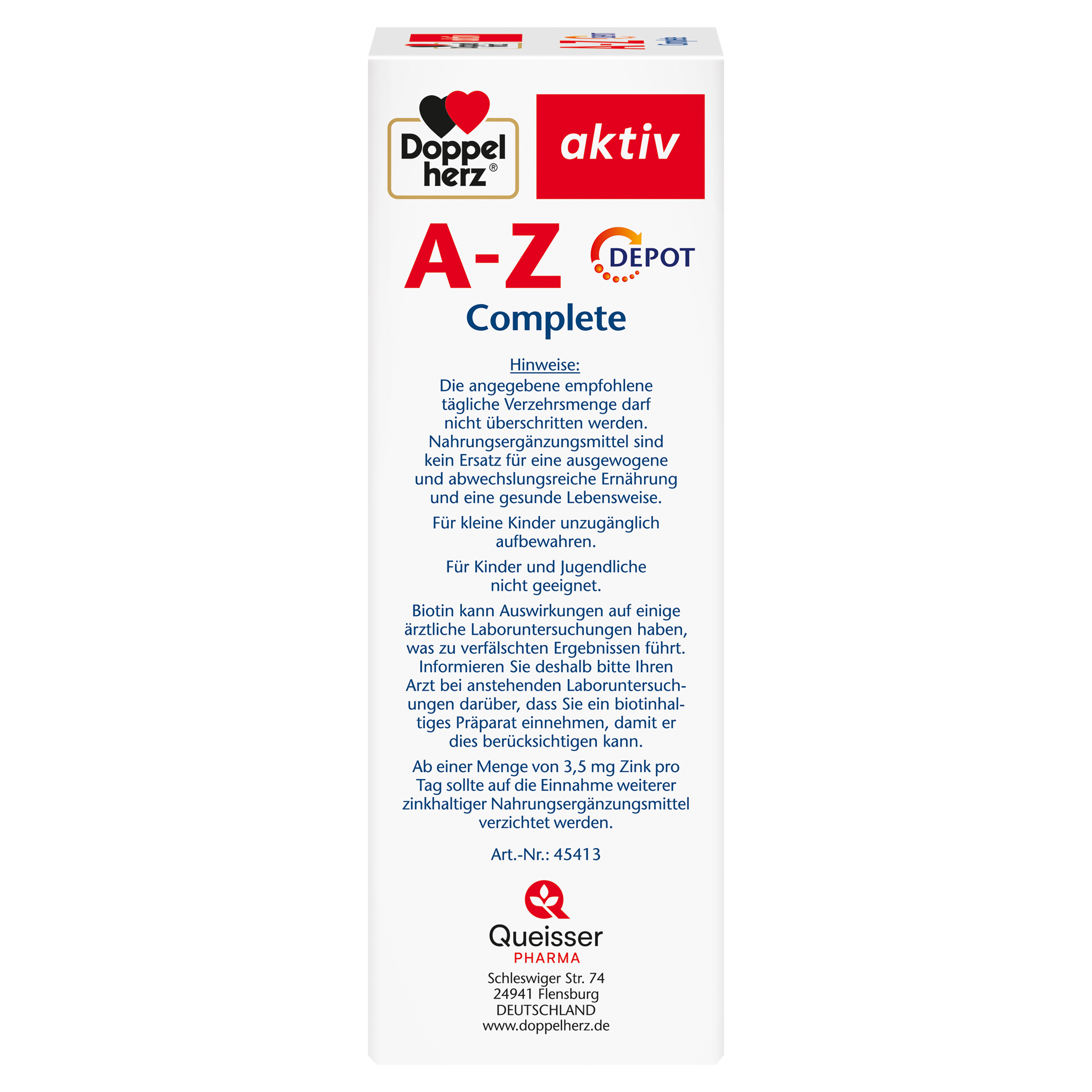 DoppelherzNahrungsergänzungsmittel sind kein Ersatz für eine ausgewogene und abwechslungsreiche Ernährung und eine gesunde Lebensweise. Die angegebene empfohlene tägliche Verzehrsmenge darf nicht überschritten werden. Außerhalb der Reichweite von kleinen Kindern aufbewahren.
