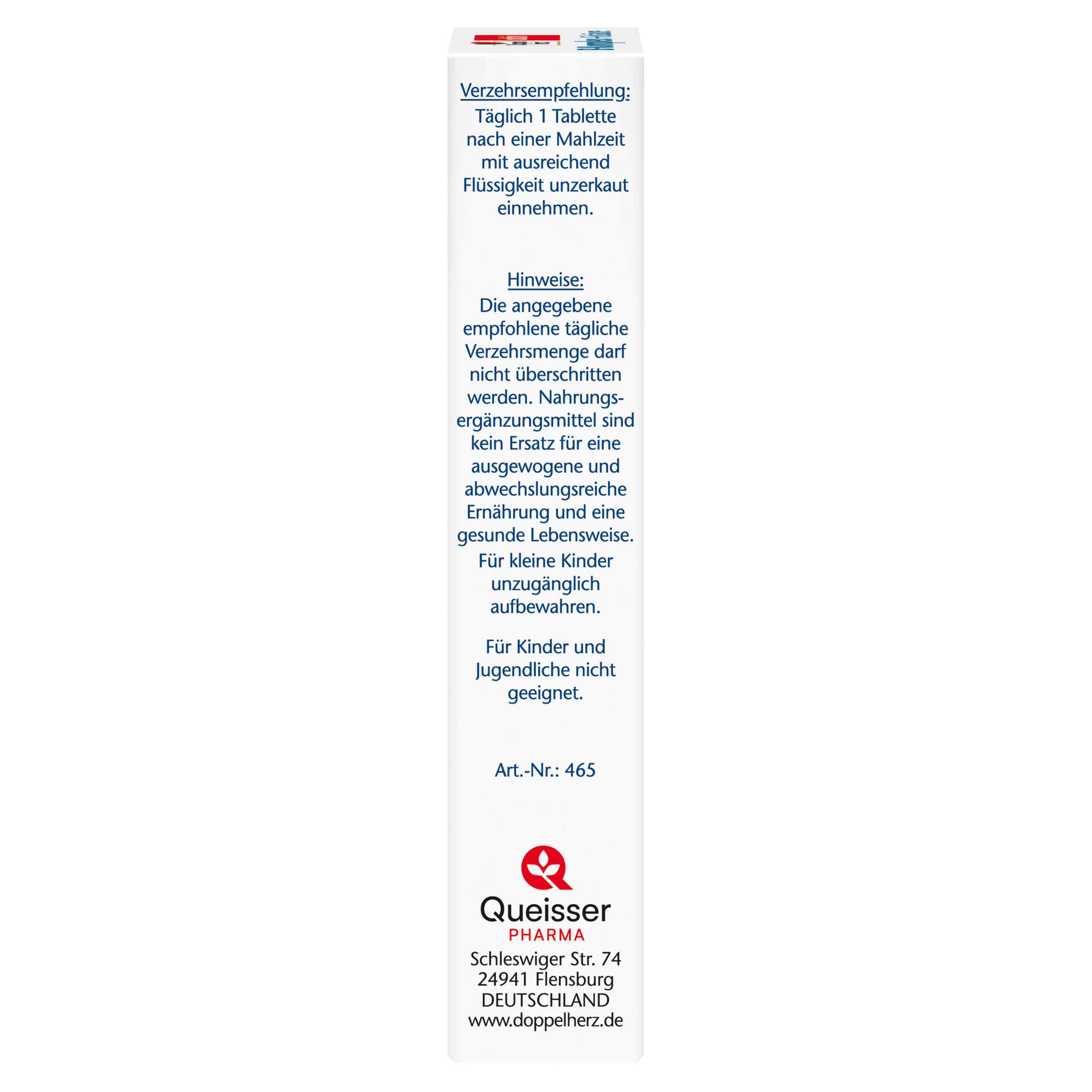DoppelherzNahrungsergänzungsmittel sind kein Ersatz für eine ausgewogene und abwechslungsreiche Ernährung und eine gesunde Lebensweise. Die angegebene empfohlene tägliche Verzehrsmenge darf nicht überschritten werden. Außerhalb der Reichweite von kleinen Kindern aufbewahren.