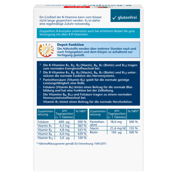DoppelherzNahrungsergänzungsmittel sind kein Ersatz für eine ausgewogene und abwechslungsreiche Ernährung und eine gesunde Lebensweise. Die angegebene empfohlene tägliche Verzehrsmenge darf nicht überschritten werden. Außerhalb der Reichweite von kleinen Kindern aufbewahren.