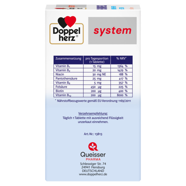 DoppelherzNahrungsergänzungsmittel sind kein Ersatz für eine ausgewogene und abwechslungsreiche Ernährung und eine gesunde Lebensweise. Die angegebene empfohlene tägliche Verzehrsmenge darf nicht überschritten werden. Außerhalb der Reichweite von kleinen Kindern aufbewahren.