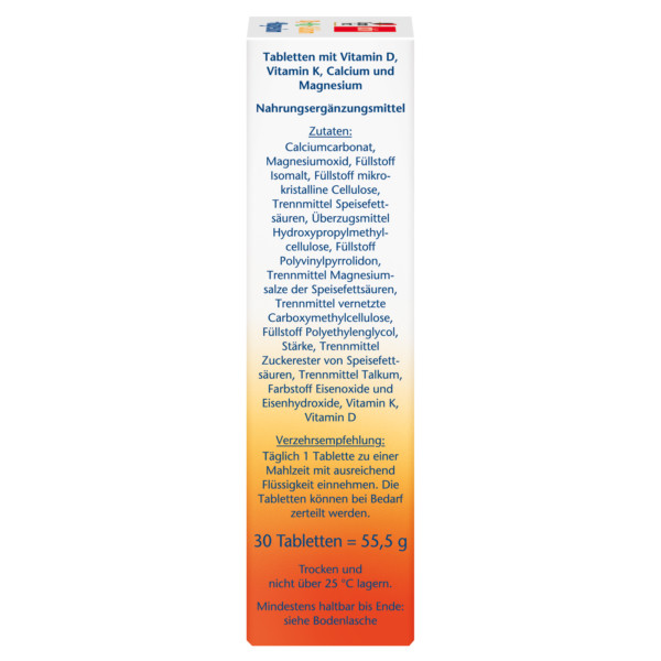 Calciumcarbonat, Magnesiumoxid, Füllstoff Isomalt, Füllstoff mikrokristalline Cellulose, Trennmittel Speisefettsäuren, Überzugsmittel Hydroxypropylmethylcellulose, Füllstoff Polyvinylpyrrolidon, Trennmittel Magnesiumsalze der Speisefettsäuren, Trennmittel vernetzte Carboxymethylcellulose, Füllstoff Polyethylenglycol, Stärke, Trennmittel Zuckerester von Speisefettsäuren, Trennmittel Talkum, Farbstoff Eisenoxide und Eisenhydroxide, Vitamin K, Vitamin D