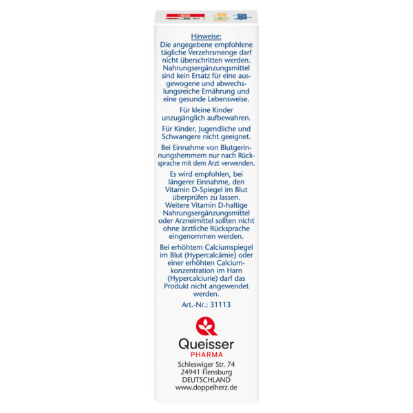DoppelherzNahrungsergänzungsmittel sind kein Ersatz für eine ausgewogene und abwechslungsreiche Ernährung und eine gesunde Lebensweise. Die angegebene empfohlene tägliche Verzehrsmenge darf nicht überschritten werden. Außerhalb der Reichweite von kleinen Kindern aufbewahren.