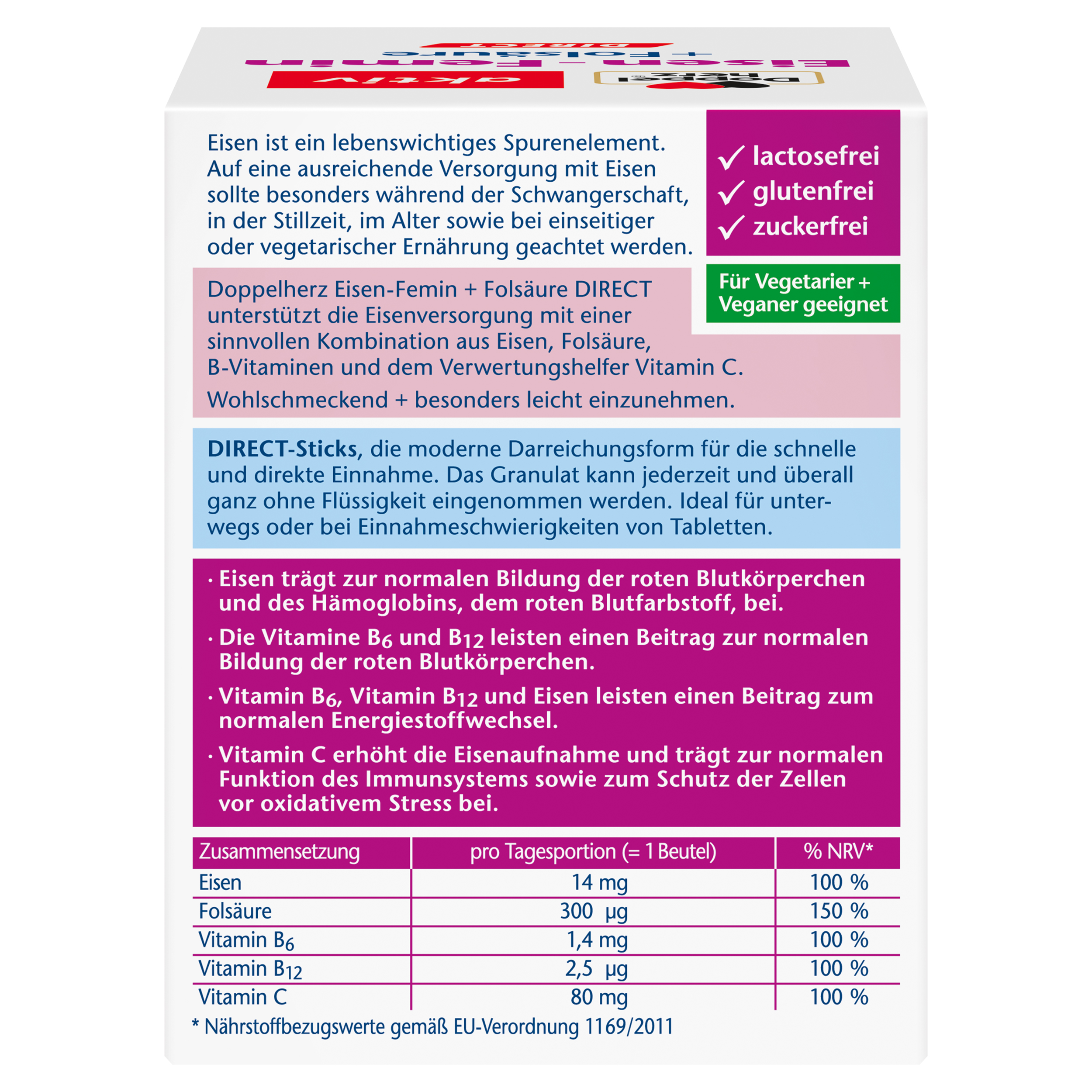 Doppelherz Eisen-Femin DIRECT enthält neben 14 mg Eisen eine Kombination aus Folsäure, Vitamin B6, B12 und Vitamin C.