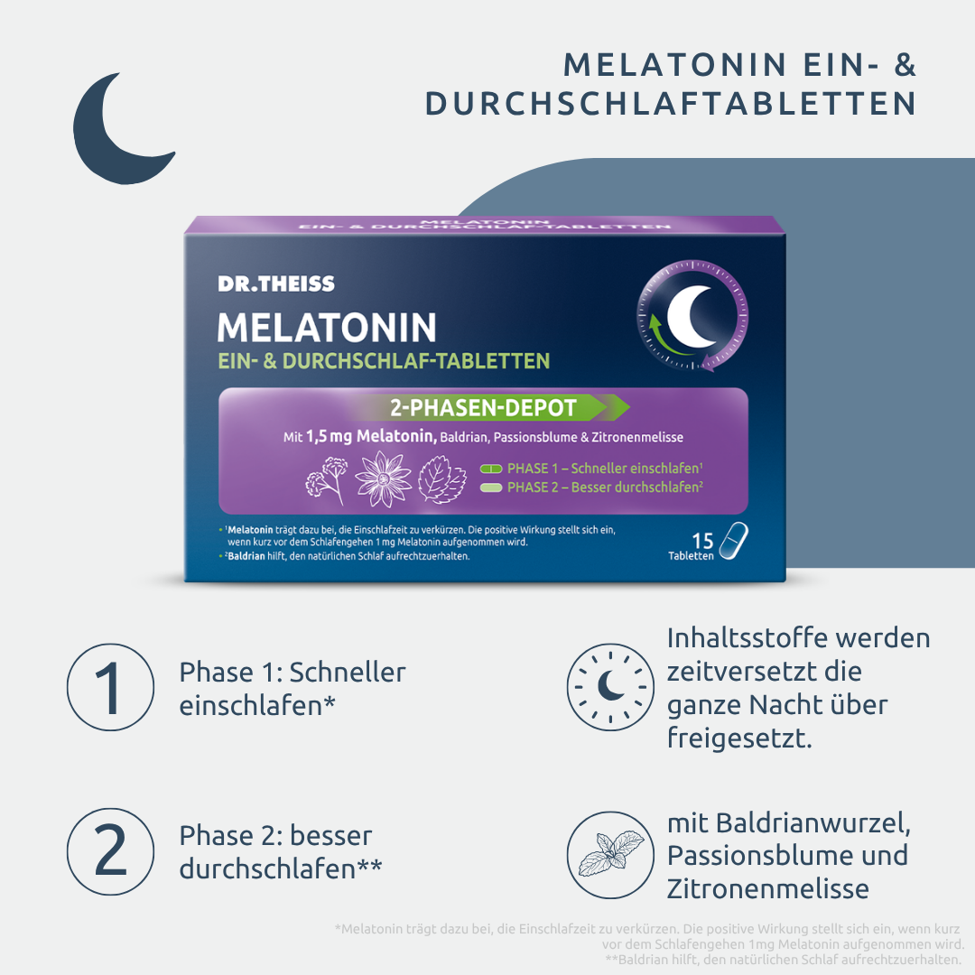 Vertrauen Sie bei Schlafproblemen auf DR. THEISS – Die meistverkauften Melatonin-Produkte in der deutschen Apotheke*. DR. THEISS Melatonin Ein- & Durchschlaf-Tabletten sind ein Nahrungsergänzungsmittel mit Melatonin und Extrakten aus Baldrianwurzel, Passionsblume und Zitronenmelisse. Melatonin ist ein natürlich vorkommendes Hormon, das von der Zirbeldrüse in unserem Gehirn produziert wird. Es spielt eine wichtige Rolle bei der Regulation unseres Schlaf-Wach-Zyklus. Melatonin wird oft als Einschlafhilfe verwendet, um Menschen dabei zu helfen, besser einzuschlafen und durchzuschlafen. Stressige Lebensphasen, Schicht- und Nachtarbeit oder lange Flugreisen über mehrere Zeitzonen hinweg, können zu Schlafproblemen führen. Für viele Menschen, die unter Schlafstörungen leiden, kann Melatonin eine effektive Lösung sein. Schlafstörungen können verschiedene Formen annehmen, wie zum Beispiel Schwierigkeiten beim Einschlafen, häufiges Aufwachen während der Nacht oder das Gefühl von nicht erholsamem Schlaf. In solchen Fällen kann die Einnahme von Melatonin z. B. in Form von Ein- & Durchschlaf-Tabletten helfen, den Schlaf-Wach-Rhythmus zu regulieren und die Schlafqualität zu verbessern. Erholsamer Schlaf ist wichtig, um die körperliche und geistige Gesundheit sowie Leistungsfähigkeit zu erhalten. Während des Schlafs erholt sich unser Körper von den Aktivitäten des Tages und bereitet sich auf den nächsten Tag vor. Stressige Lebensphasen, Schicht- und Nachtarbeit können zu Einschlafproblemen führen. DR. THEISS Melatonin Ein- & Durchschlaf-Tabletten mit einem innovativen 2-Phasen-Freisetzungsprozess: 1. Phase (schneller einschlafen): 1 mg Melatonin* trägt dazu bei die Einschlafzeit zu verkürzen. Passionsblume und Zitronenmelisse können den Schlaf unterstützen und für Entspannung sorgen. 2. Phase (besser durchschlafen**): 0,5 mg Melatonin und Baldrianwurzel-Extrakt** werden zeitversetzt abgegeben. Baldrian unterstützt das Durchschlafen. • Nahrungsergänzungsmittel bei Schlafproblemen • Schneller einschlafen, besser durchschlafen • Schlaftabletten (Nahrungsergänzungsmittel) mit 2-Phasen-Freisetzungsprozess • Unterstützung des natürlichen Schlafzyklus • Mit Melatonin, Passionsblumen- und Baldrianextrakt und Zitronenmelisse. • Laktosefrei, zuckerarm und alkoholfrei • Vegan *Melatonin trägt dazu bei, die Einschlafzeit zu verkürzen. Die positive Wirkung stellt sich ein, wenn kurz vor dem Schlafengehen 1 mg Melatonin aufgenommen wird. **Baldrian hilft, den natürlichen Schlaf aufrechtzuerhalten.s