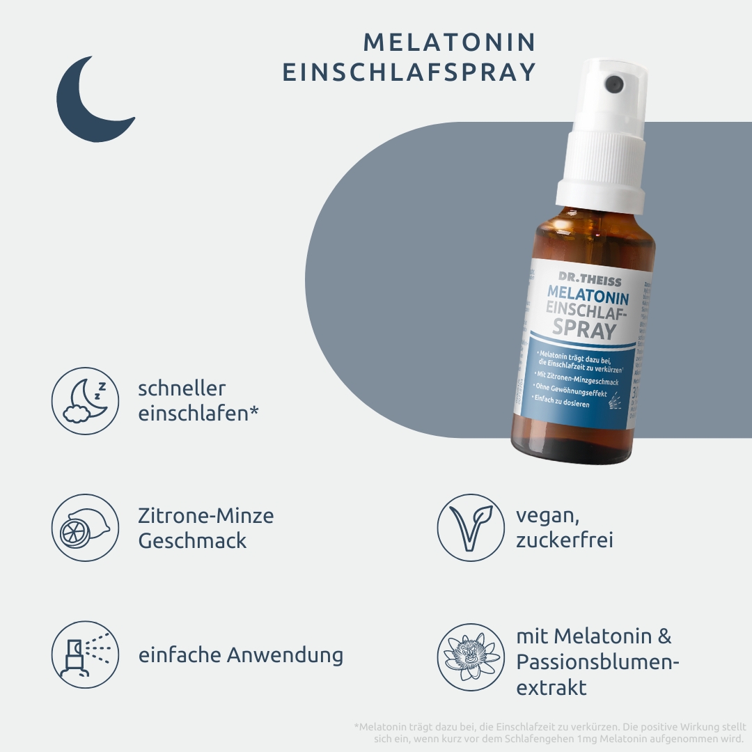 Ein erholsamer Schlaf bietet die Voraussetzung für einen guten Start in den Tag. Stressige Lebensphasen, Schicht- und Nachtarbeit oder lange Flugreisen über mehrere Zeitzonen hinweg, können zu Schlafproblemen führen. Dr. Theiss Melatonin Einschlaf-Spray kombiniert Melatonin mit Passionsblumenextrakt. Die positive Wirkung stellt sich ein, wenn kurz vor dem Schlafengehen 1 mg Melatonin aufgenommen wird. Melatonin trägt zur Linderung der subjektiven Jetlag-Empfindung bei. Die positive Wirkung stellt sich ein, wenn am ersten Reisetag kurz vor dem Schlafengehen sowie an den ersten Tagen nach Ankunft am Zielort mindestens 0,5 mg Melatonin aufgenommen werden. Das leicht anzuwendende Spray ist dank Sprühkopf einfach zu dosieren.