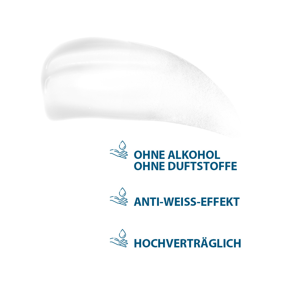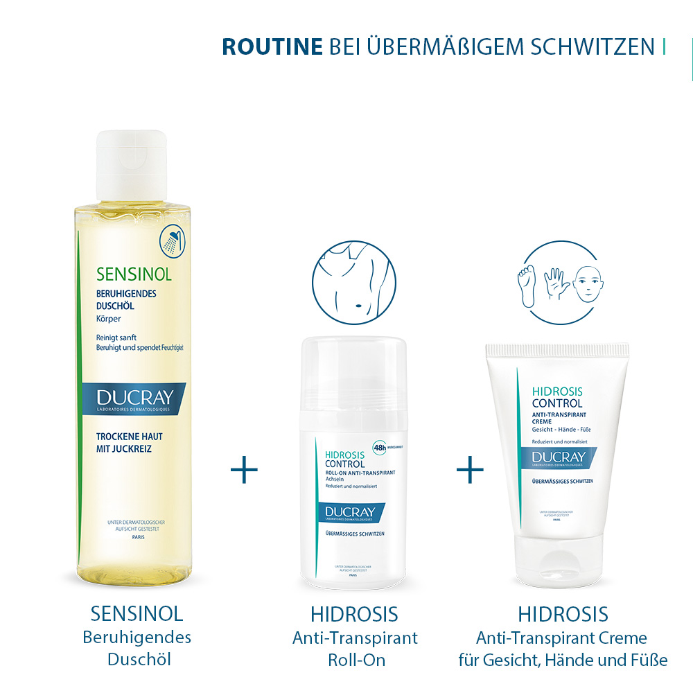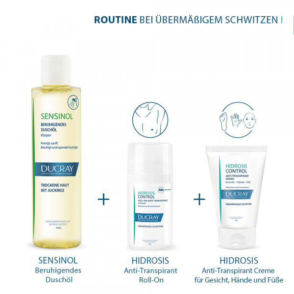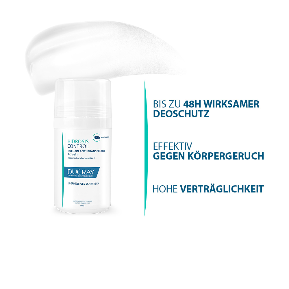 Übermäßiges Schwitzen kann verschiedene Ursachen haben. HIDROSIS CONTROL Anti-Transpirant Roll-On reguliert schnell und dauerhaft übermäßiges Schwitzen. Gegen Körpergeruch hinterlässt keine Flecken. Für alle Hauttypen, selbst für empfindliche Haut, geeignet. Entwickelt, um die Gefahr von allergischen Reaktionen zu minimieren. Hohe Verträglichkeit. Stoppt übermäßiges Schwitzen und verhindert Geruchsbildung mit 48-h-Effekt