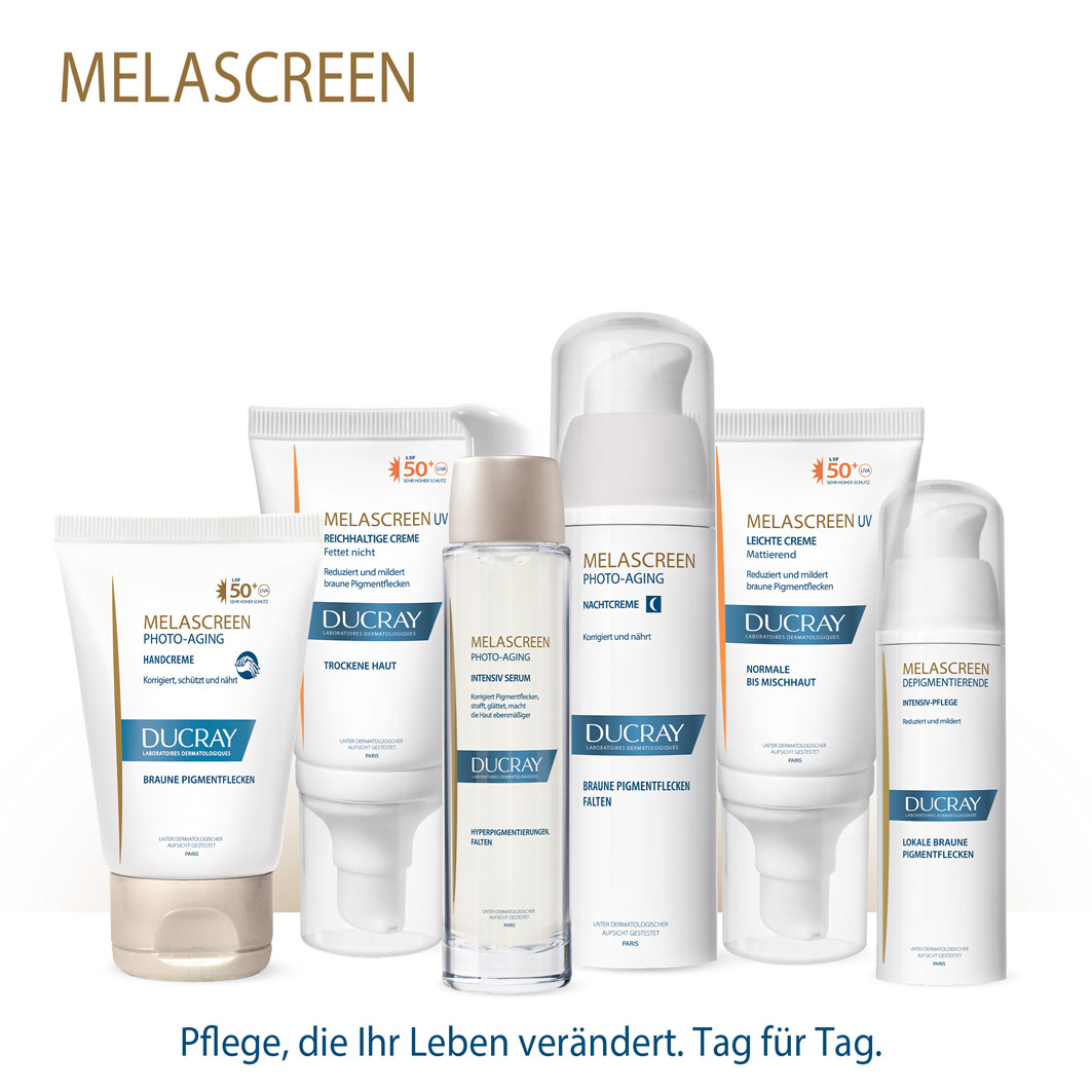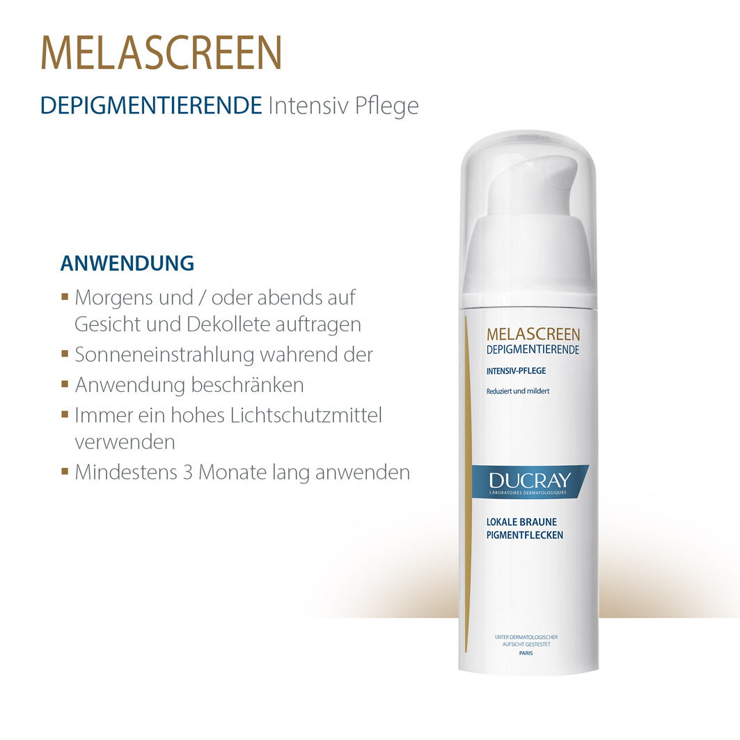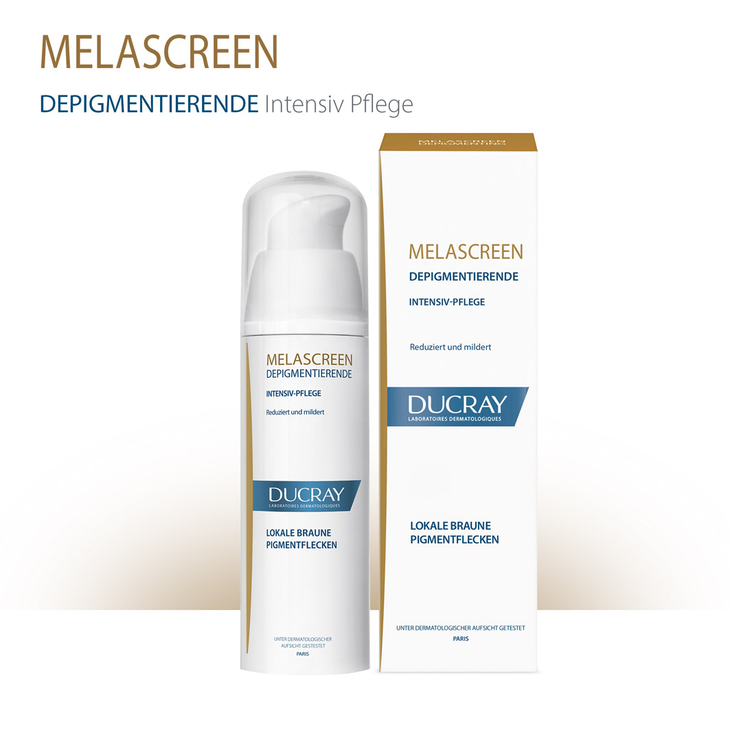 DUCRAY MELASCREEN Depigmentierende Gesichtspflege gegen lokal begrenzte Pigmentstörungen ist eine Intensivbehandlung mit einer hohen Konzentration an depigmentierenden Wirkstoffen wie Azelainsäure und Glycolsäure. Sie eignet sich für die topische Anwendung auf der Haut und wirkt gezielt gegen Pigmentstörungen auf Gesicht, Dekolleté und Händen.