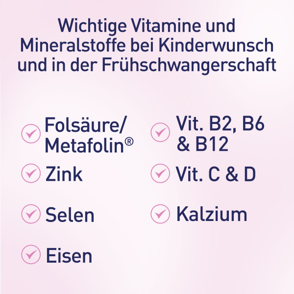 • enthalten 800 Mikrogramm Folat (davon 400 Mikrogramm Metafolin®1 und 400 Mikrogramm Folsäure), Zink, Selen, Eisen und 16 weitere, speziell kombinierte Vitamine, Spurenelemente und Mineralstoffe.