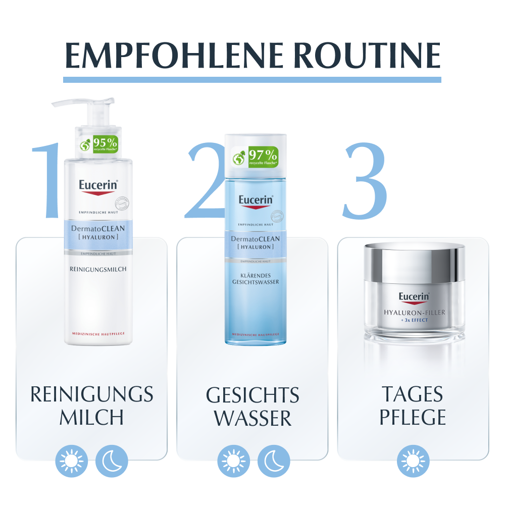 Mit dem Eucerin DermatoClean [HYALURON] Klärenden Gesichtswasser werden alle Spuren der vorherigen Reinigung entfernt. Die Haut wird somit sanft und effektiv auf die nachfolgende Pflege vorbereitet.