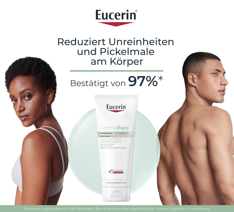 Die Eucerin DermoPure Triple Effect Körpercreme bei Akne kombiniert effektive Wirkstoffe für die Behandlung von Akne, mit denen Unreinheiten und Pickelmale reduziert werden und die Haut gleichzeitig beruhigt und mit Feuchtigkeit versorgt wird. Sie hat dabei drei Effekte: