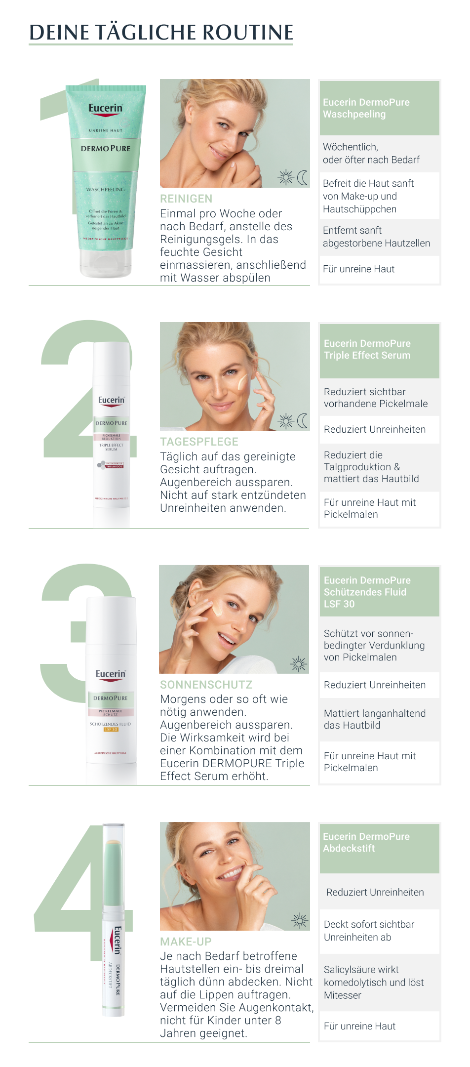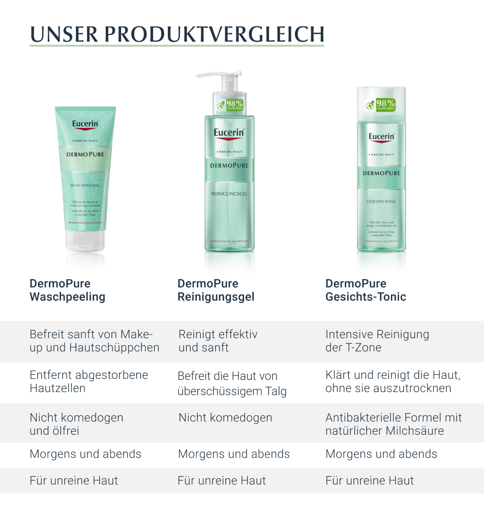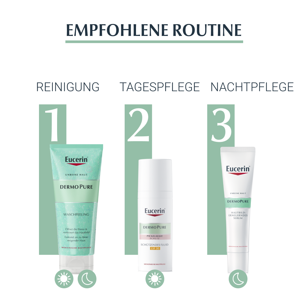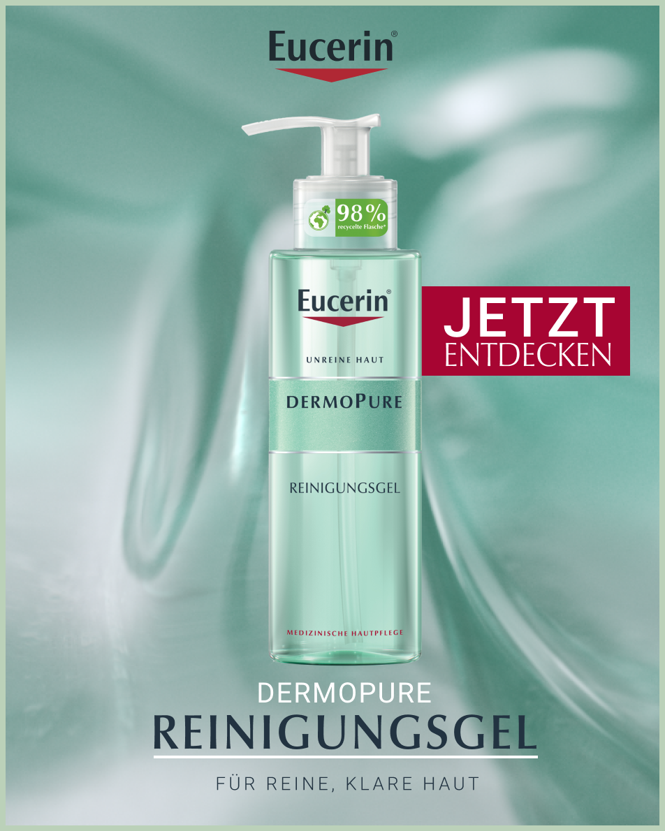 - Das Gesicht anschließend gut abspülen und eine geeignete Pflege auftragen, zum Beispiel Eucerin DermoPure Mattierendes Fluid