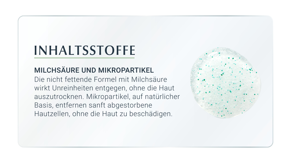 Das Peeling gegen Pickel wurde für unreine, zu Akne neigende Haut entwickelt, die nicht medikamentös behandelt wird und kann auch während einer Schwangerschaft problemlos genutzt werden.