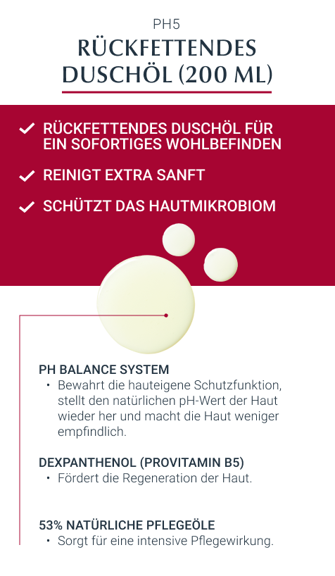 Eucerin pH5 Duschöl eignet sich speziell für die milde Reinigung von strapazierter, trockener und empfindlicher Haut. Gerade strapazierte Haut reagiert besonders auf Umweltreize mit Spannungsgefühl, Hautrötungen und -irritationen. Daher braucht sie eine milde Reinigung, die die physiologische Balance der Haut aufrechterhält.