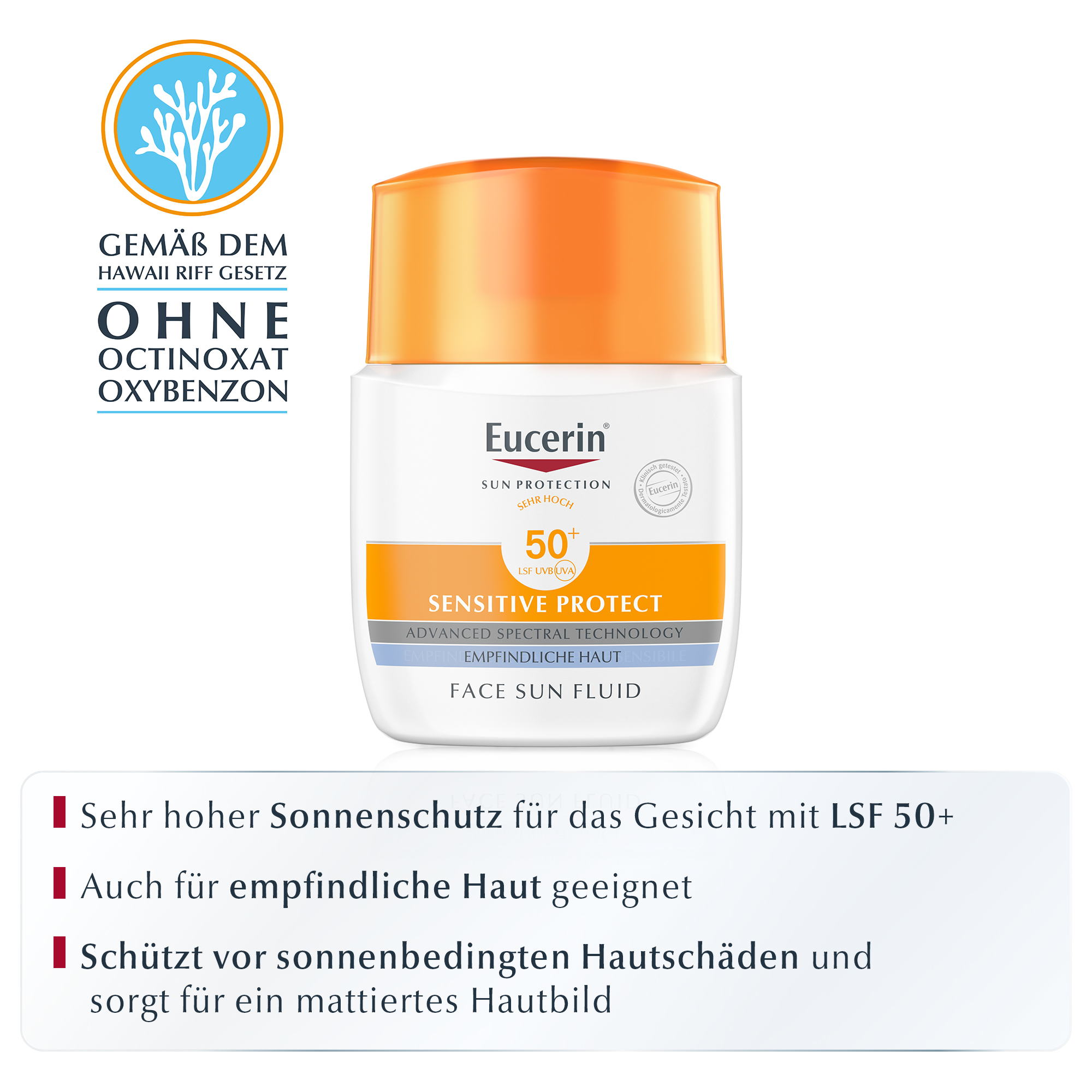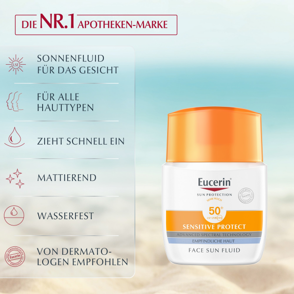 Neben UV-Strahlung kann auch das hochenergetische sichtbare Licht (HEV-Licht) der Haut erheblichen Schaden zufügen. Das Eucerin Sensitive Protect Face Sun Fluid LSF 50+ bietet höchsten Schutz vor sonnenbedingten Hautschäden. Dafür sorgt die innovative ADVANCED SPECTRAL TECHNOLOGY der Sonnencreme, die ideal vor Schäden durch UVA/UVB-Strahlen und HEV-Licht schützt.