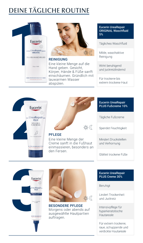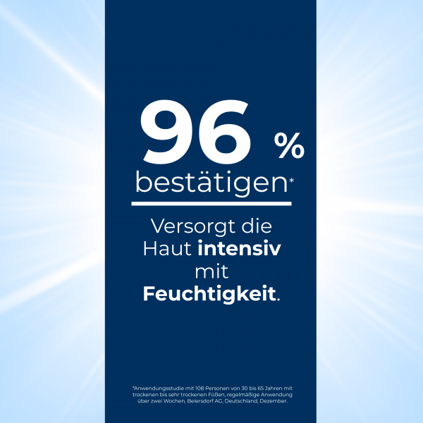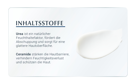 Bei den Zeichen trockener Haut an den Füßen verbessert der einzigartige Repair-PLUS-Komplex der Fußpflege die Feuchtigkeitsbindung der Haut und bringt den Lipid-(Fett-) und Feuchtigkeitshaushalt wieder in ein natürliches Gleichgewicht. Dies wird durch die Kombination der Wirkstoffe Urea, Ceramide sowie natürlichen Feuchthaltefaktoren erreicht. Ebenso versorgt die Hautcreme raue Haut an den Füßen und rissige Fersen intensiv.