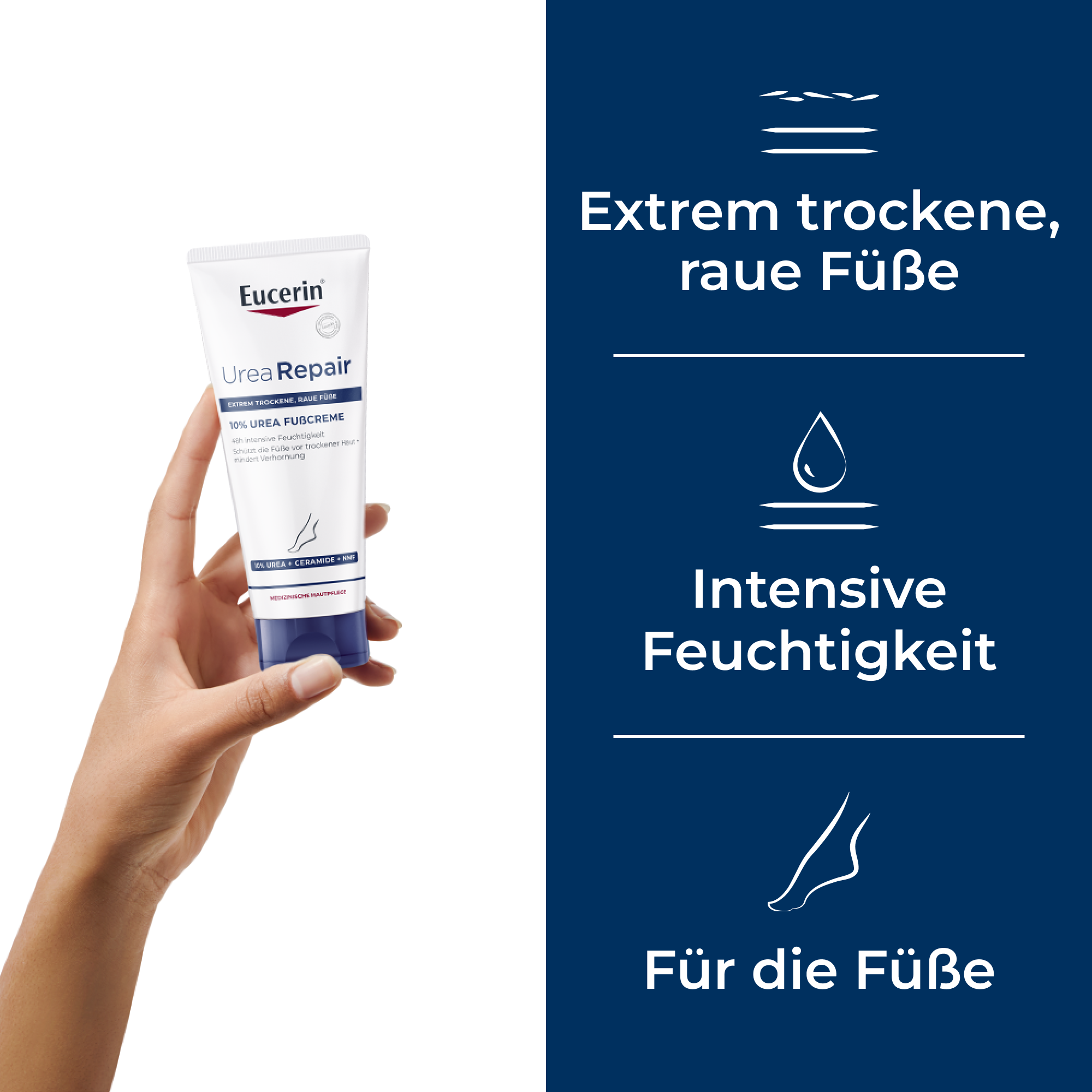 Die Eucerin UreaRepair PLUS Fußcreme 10% spendet intensive Feuchtigkeit bei trockenen bis extrem trockenen Füßen und beruhigt die Haut sofort. Die Hautbarriere wird gestärkt sowie Druckstellen und Verhornung reduziert. Insbesondere auch zur Fußpflege bei Diabetes geeignet.