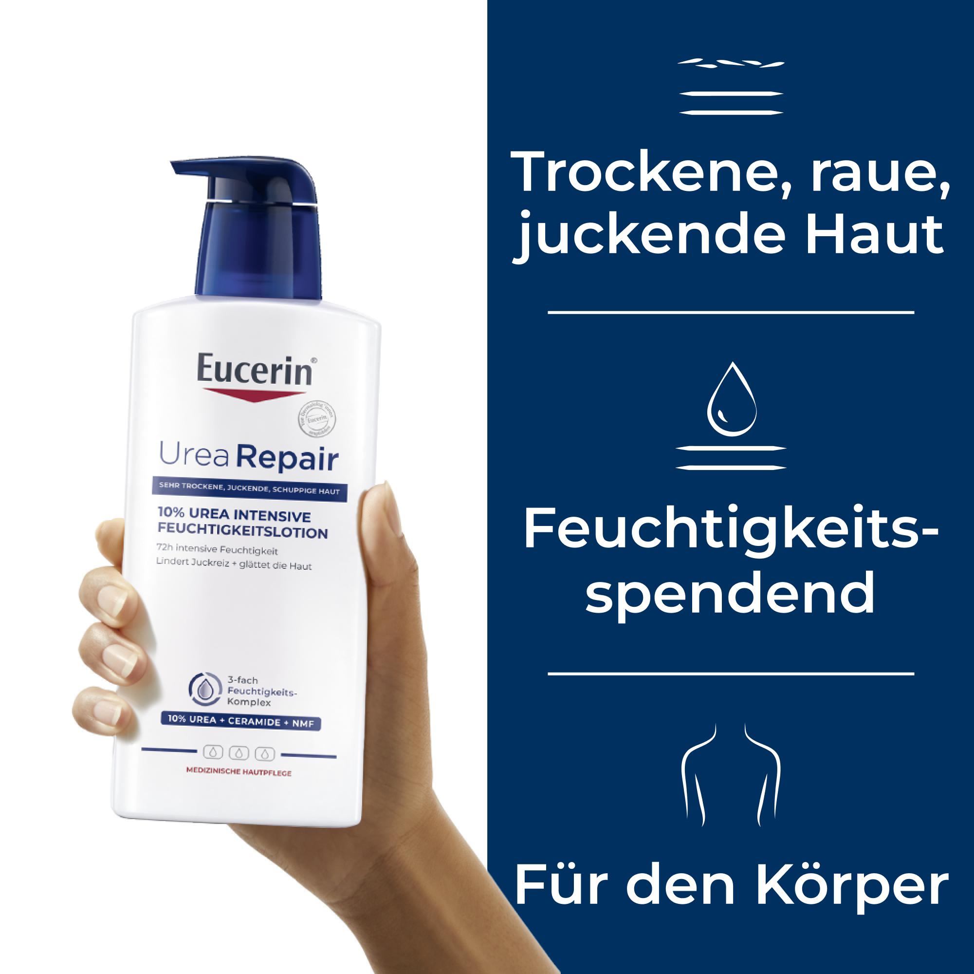 Der Repair-PLUS-Komplex der parfümfreien Bodylotion verbessert die Feuchtigkeitsbindung der Haut und bringt den Lipid-(Fett-) und Feuchtigkeitshaushalt wieder in ein natürliches Gleichgewicht. Dies wird durch die Kombination der Wirkstoffe Urea, Ceramide sowie die natürlichen Feuchthaltefaktoren erreicht. Spannungsgefühl, Juckreiz oder Schuppung werden sofort gelindert. Die Feuchtigkeitscreme ist therapiebegleitend auch zur Pflege z. B. bei diabetischer Haut, Psoriasis und Keratosis pilaris geeignet.