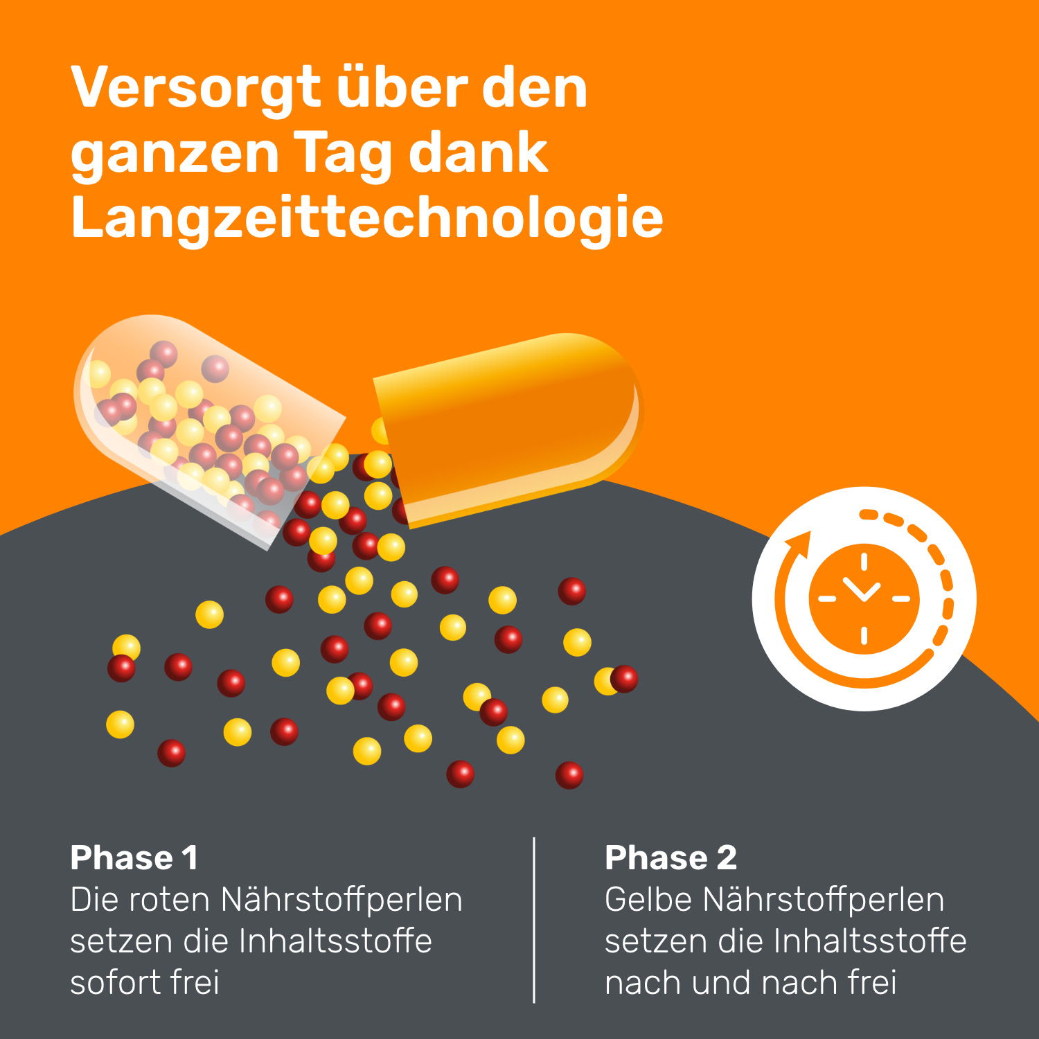 • Spezielle Langzeittechnologie ermöglicht zeitverzögerte Freisetzung der Vitamine für eine sinnvolle Versorgung über den ganzen Tag