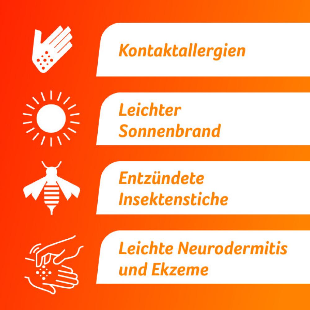 - Bekämpft die Symptome der entzündeten Haut z.B. bei Sonnenbrand (ersten Grades), Kontaktallergie, leichter Neurodermitis, Ekzemen, Sonnenallergie oder entzündeten Insektenstichen
