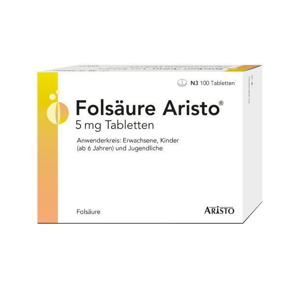 Folsäure ist maßgeblich an der Blutbildung sowie am Wachstum und an der Vermehrung unserer Zellen beteiligt. Das essentielle Vitamin ist für alle Entwicklungs- und Erneuerungsprozesse in unserem Körper unentbehrlich. Das gilt auch für die gute Entwicklung eines Babys im Mutterleib. Die empfohlene Tageszufuhr beträgt 300 μg (Mikrogramm). Sie wird in Deutschland von einem großen Teil der Erwachsenen nicht erreicht. Folsäure Aristo® 5 mg von Aristo Pharma ist ein Arzneimittel mit dem bewährten Wirkstoff zur Vorbeugung und zum Ausgleich von Folatmangel.