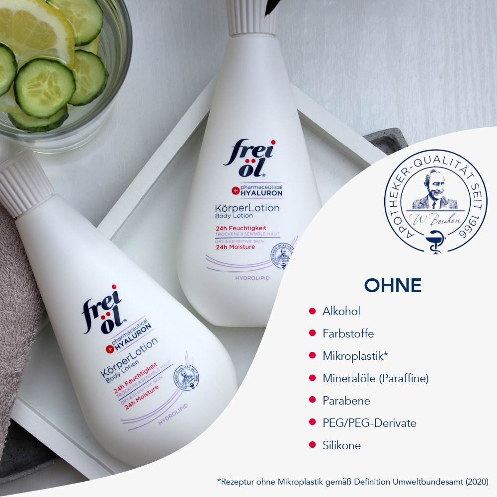 Die leichte KörperLotion hüllt Ihre Haut in pures Wohlgefühl. Das Hyaluron in reiner pharmazeutischer Qualität und Aloe vera dringen intensiv in die Haut ein und versorgen sie für 24 Stunden mit viel Feuchtigkeit. Natürliches Jojobaöl sorgt für zarte Pflege, Vitamin A und E unterstützen die Regeneration, während Panthenol und Bisabolol die Haut zusätzlich beruhigen. Der Unterschied ist sofort spürbar – die KörperLotion zieht schnell ein und fettet nicht. Die Haut fühlt sich geschmeidig an und sieht gepflegt aus. Ideal für trockene und sensible Haut. frei öl® KörperLotion – Tag für Tag sanfte Pflege für ein spürbar entspanntes Hautgefühl.