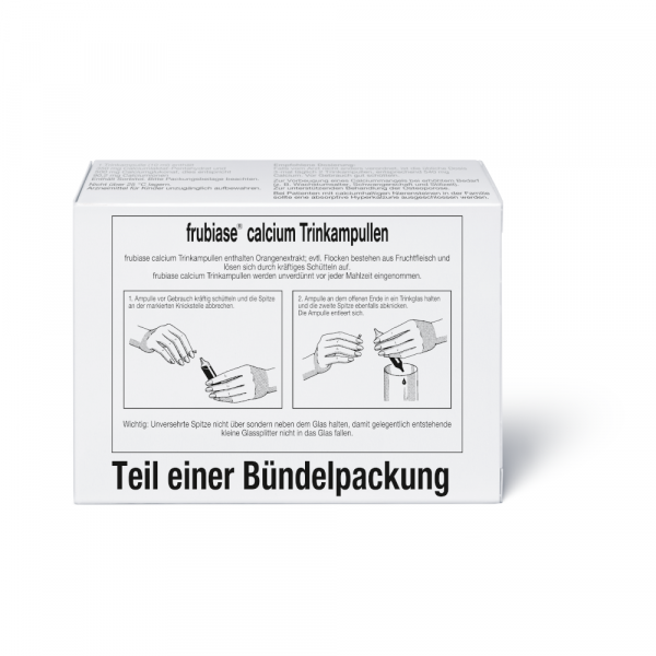 frubiase calcium Trinkampullen sind ein Mineralstoffpräparat. frubiase calcium Trinkampullen werden angewendet zur Vorbeugung eines Calciummangels bei erhöhtem Bedarf (z.B. Wachstumsalter, Schwangerschaft und Stillzeit) und zur unterstützenden Behandlung der Osteoporose.